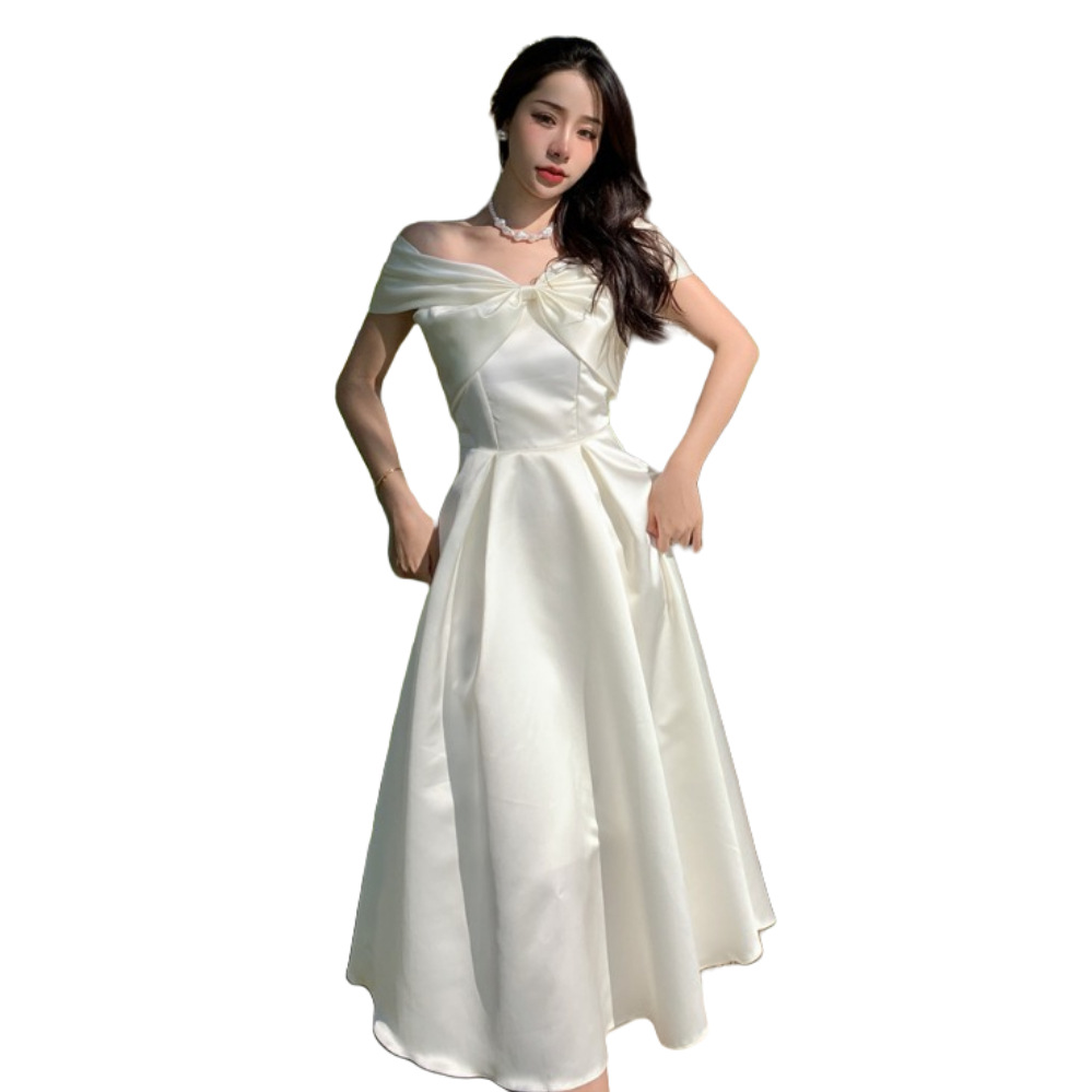 法式小众礼服女平时可穿白色仙女连衣裙蝴蝶结一字领抹胸拍照长裙