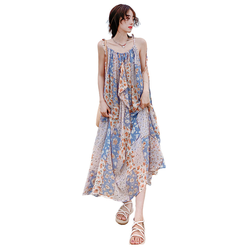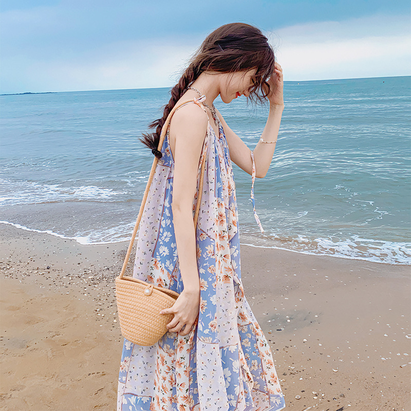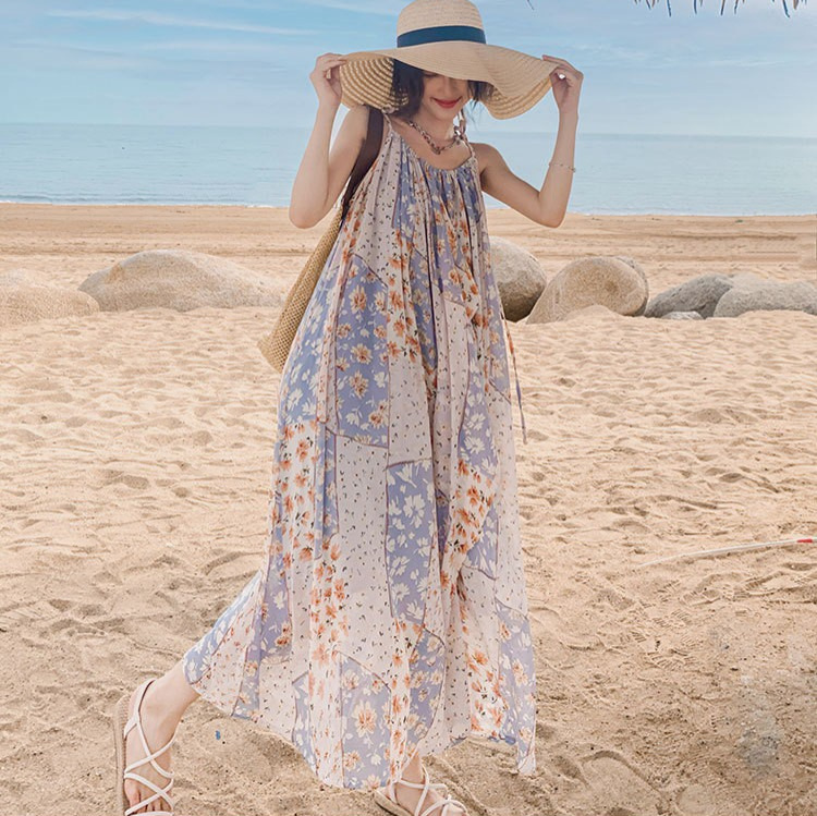 蓝色沙滩度假连衣裙三亚泰国海边雪纺吊带裙宽松夏季新款海岛裙子