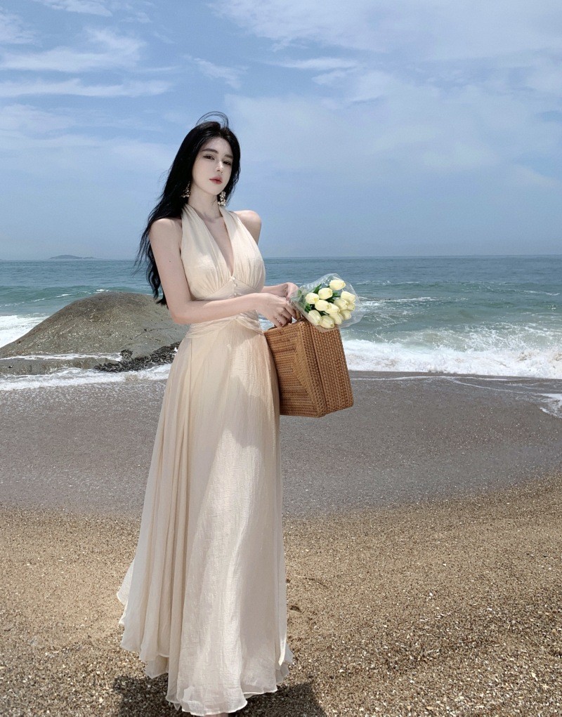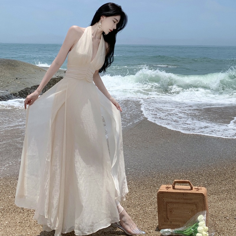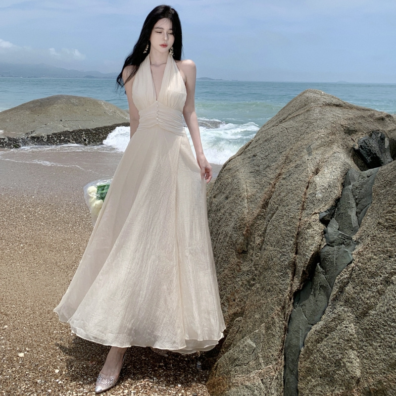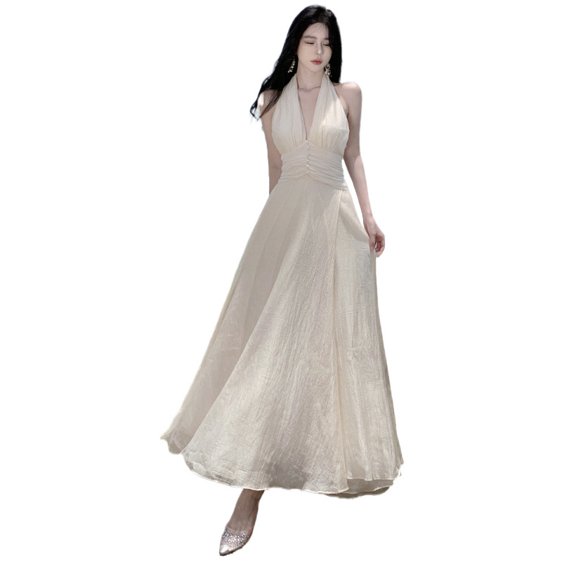实拍美神降临无袖V领挂脖连衣裙夏季新款温柔气质收腰显瘦长裙子