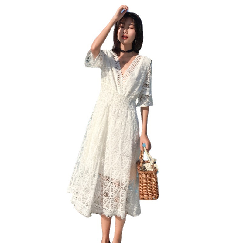 实拍夏季新款巴厘岛蕾丝镂空流苏连衣裙度假显瘦修身超仙气质裙