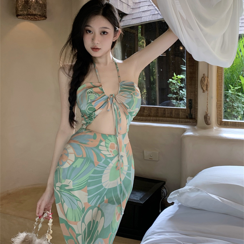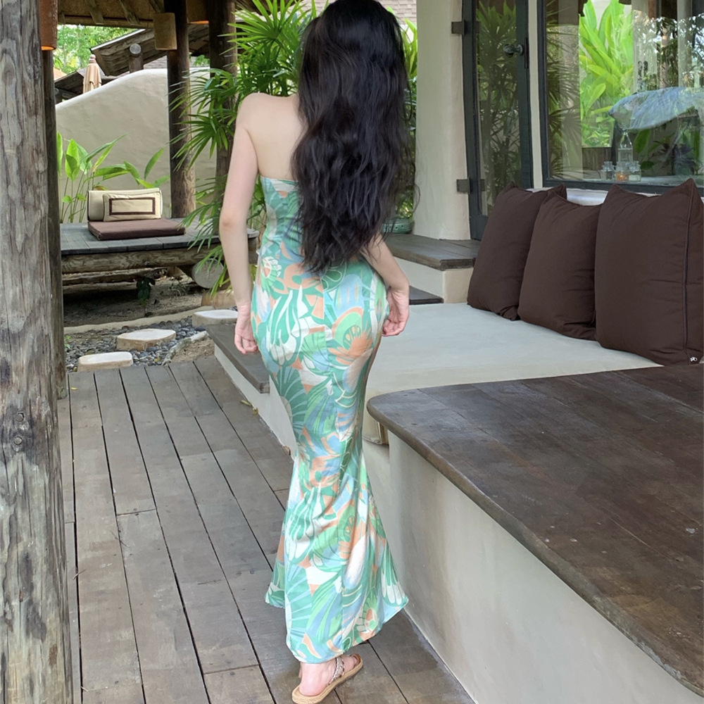 海边度假沙滩裙西双版纳旅游设计感纯欲气质印花吊带连衣裙长裙子