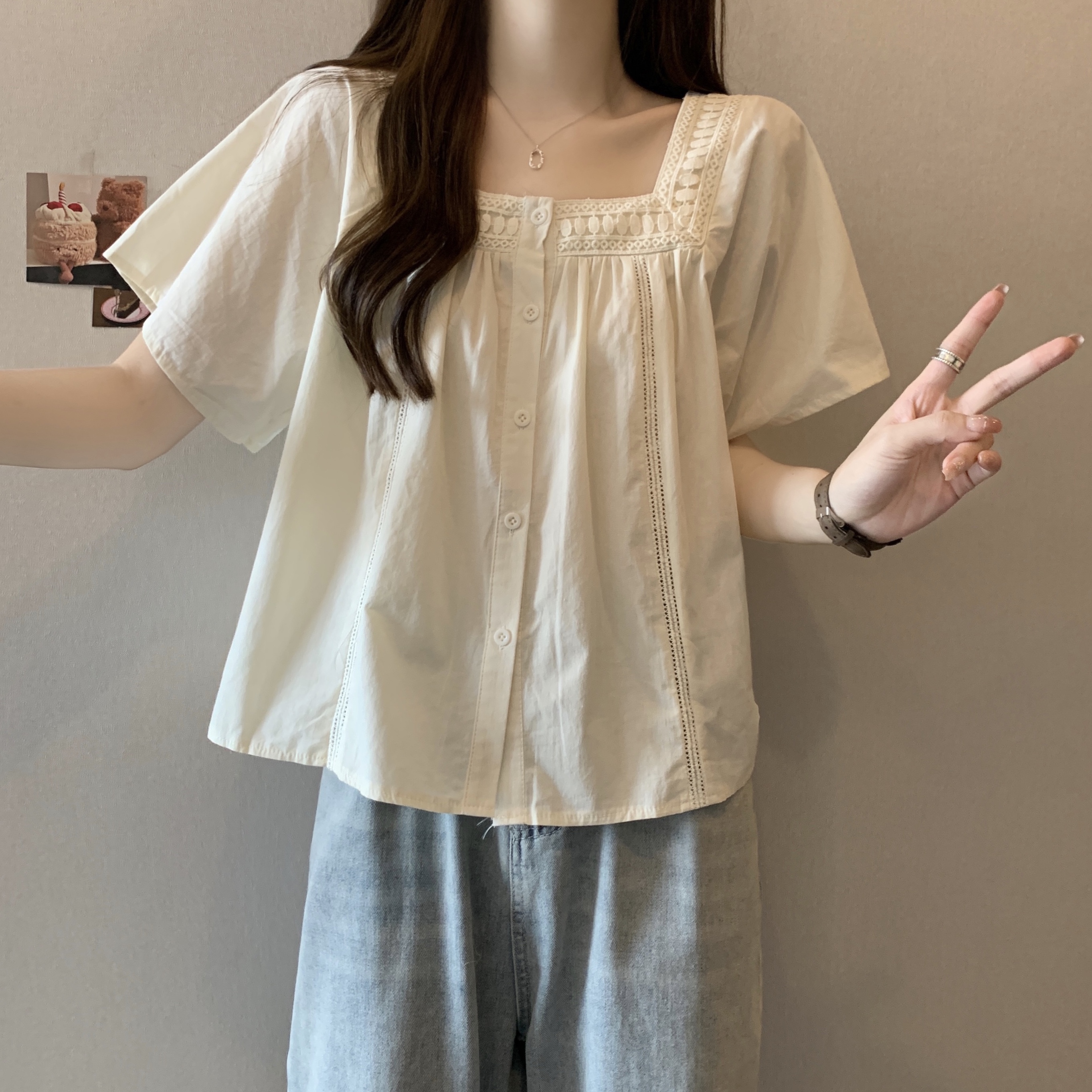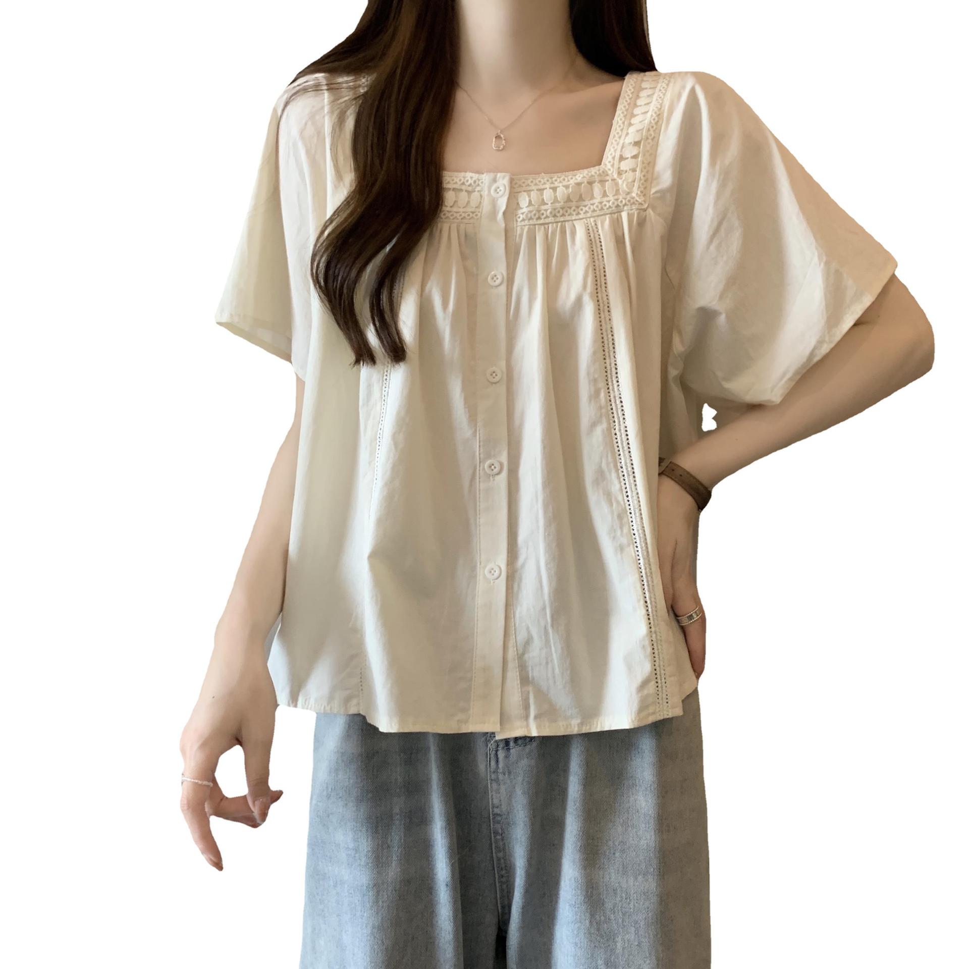 大码衬衫夏季新款正肩方领短袖t恤女宽松设计感微胖法式上衣