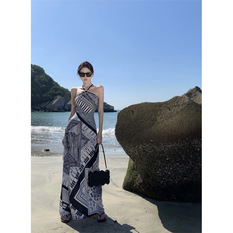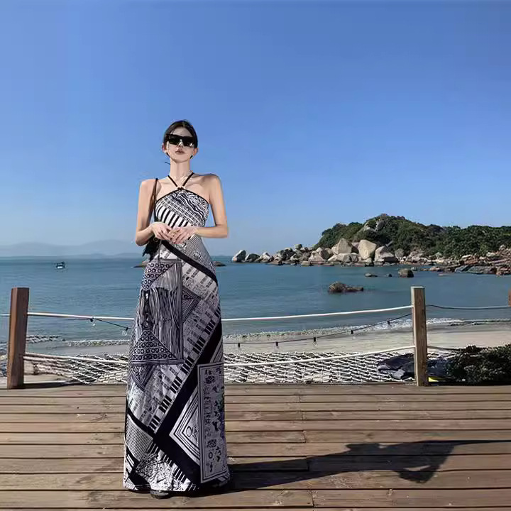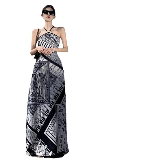 新中式挂脖抹胸吊带连衣裙女复古抽象印花长裙子高级氛围感度假裙