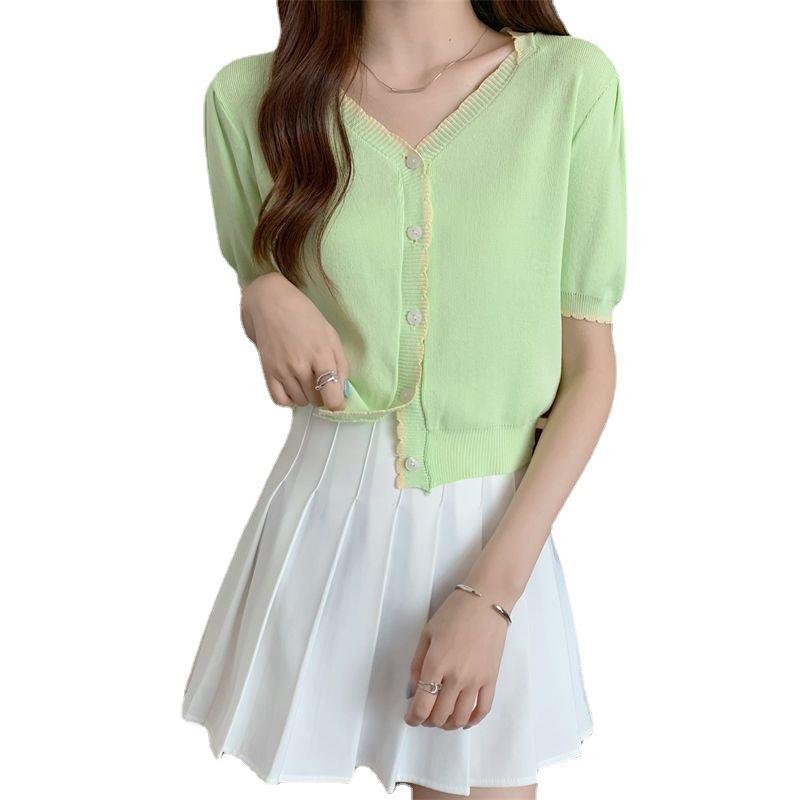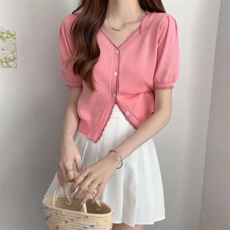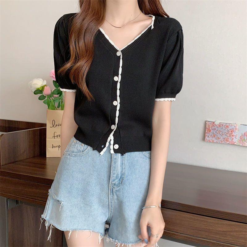冰丝短袖正肩t恤女夏季法式锁骨方领小衫别致泡泡袖短款上衣