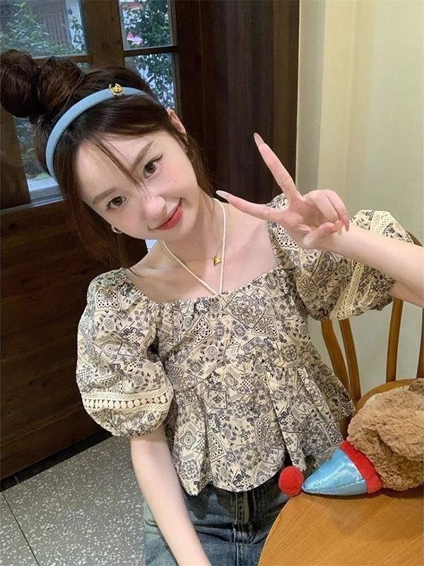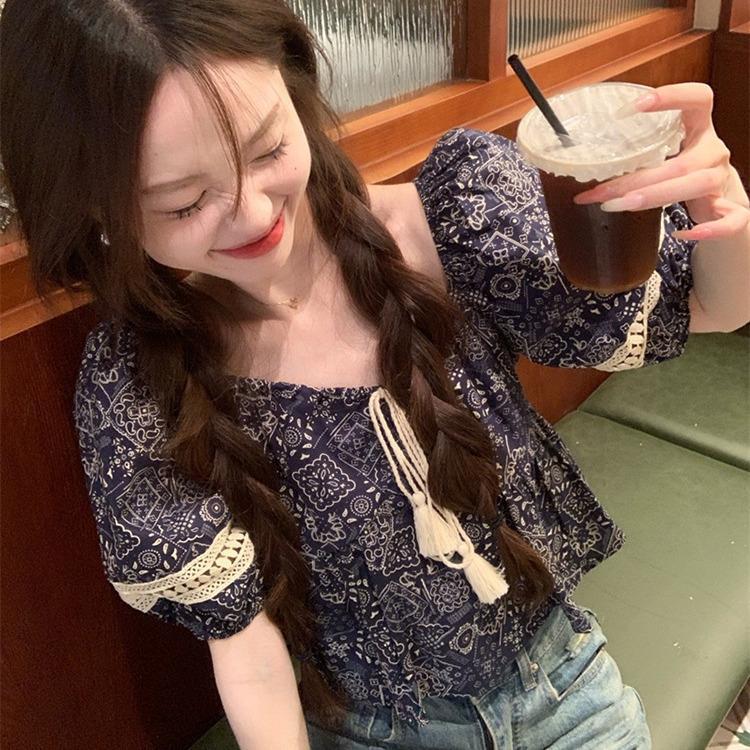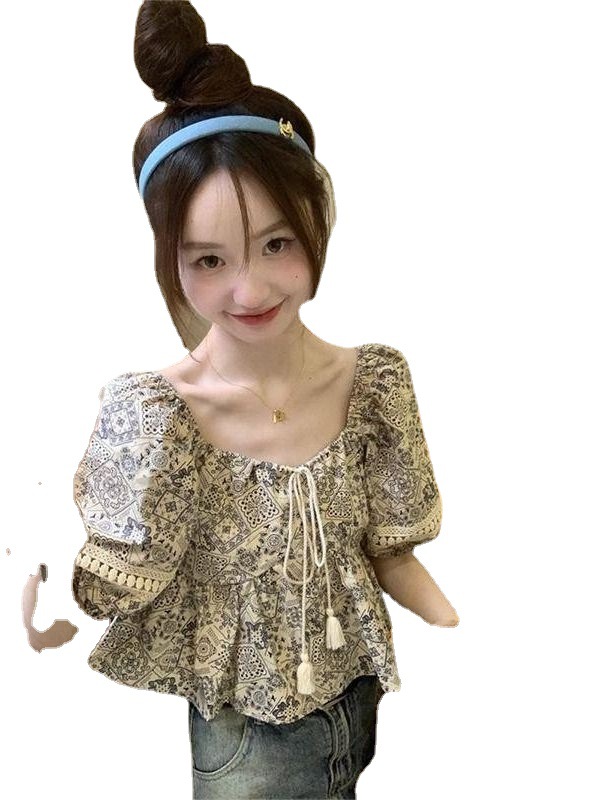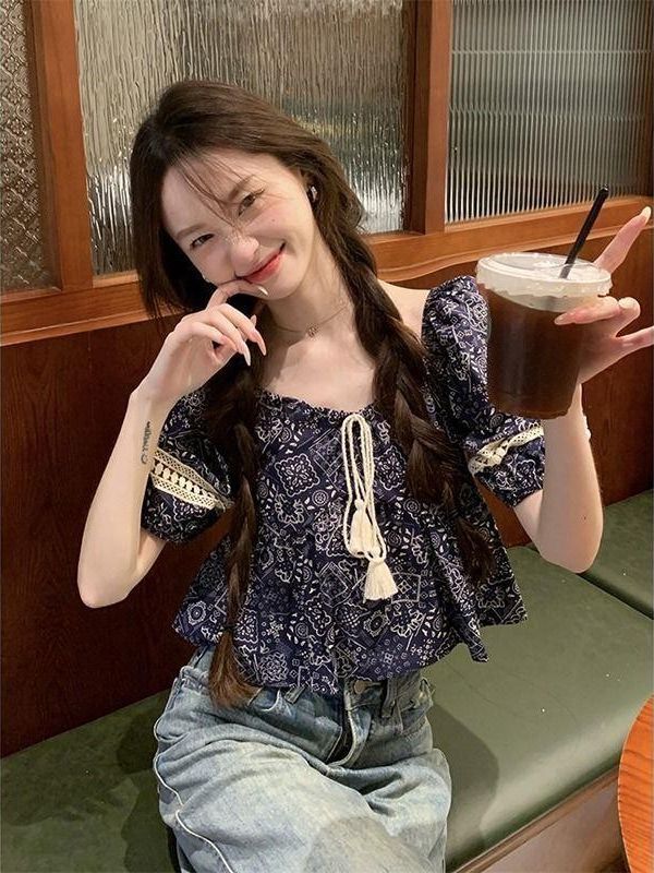 韩版方领泡泡袖衬衫女夏季新款流苏系带设计感镂空短袖上衣潮