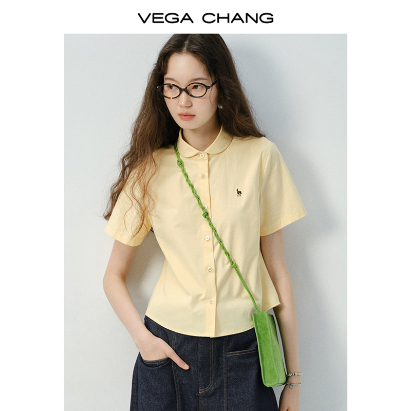 VEGA CHANG短袖衬衫女2025新款夏气质减龄娃娃领正肩显瘦绣花衬衣