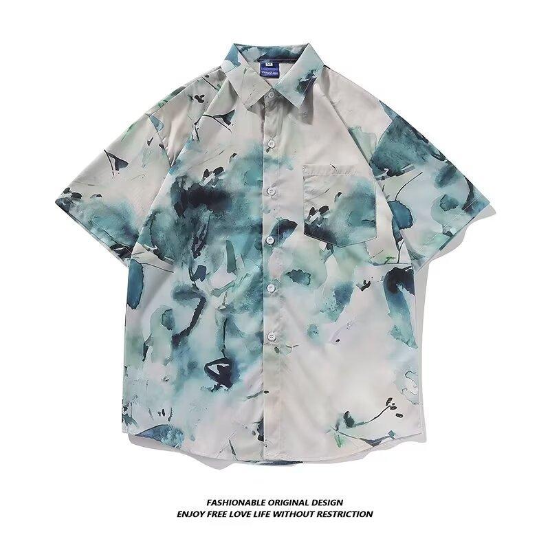 夏威夷度假沙滩凉快花式短袖衬衫男宽松痞帅日系复古潮流扎染上衣
