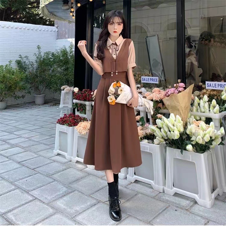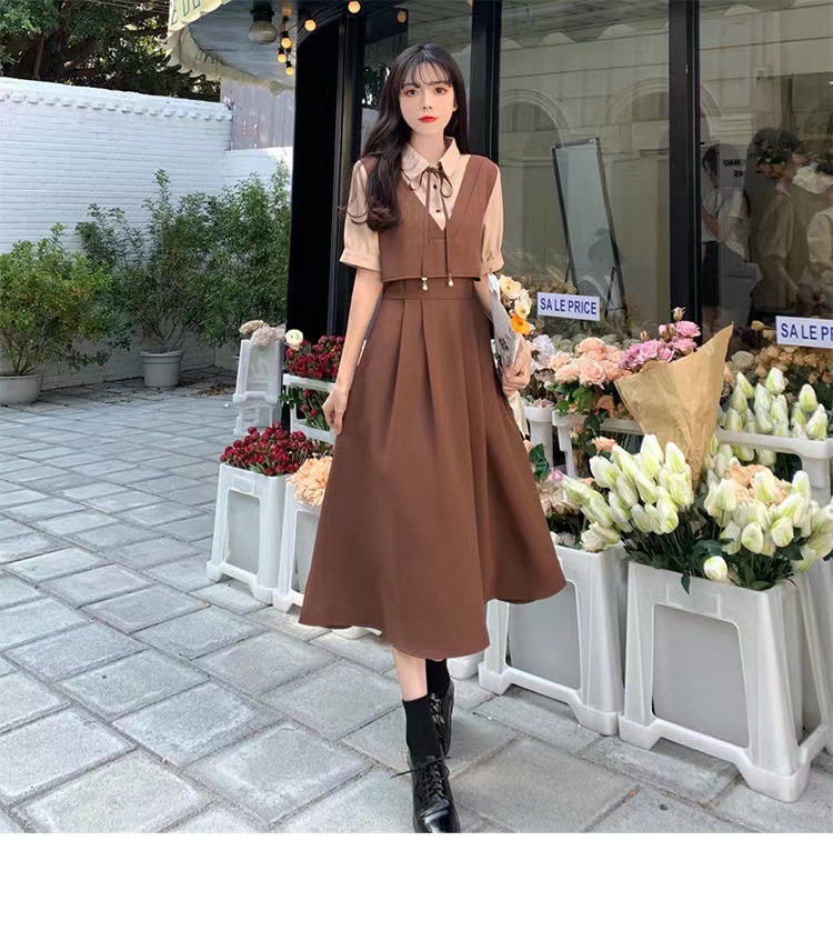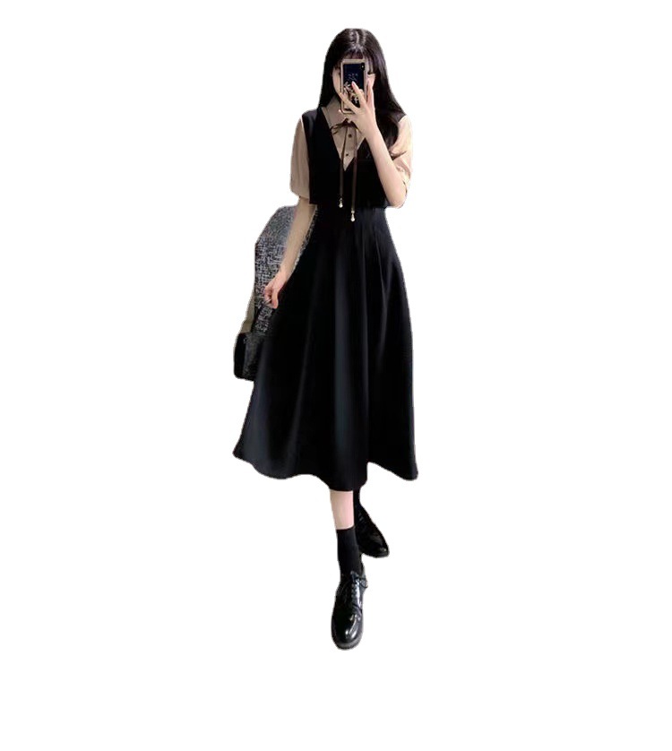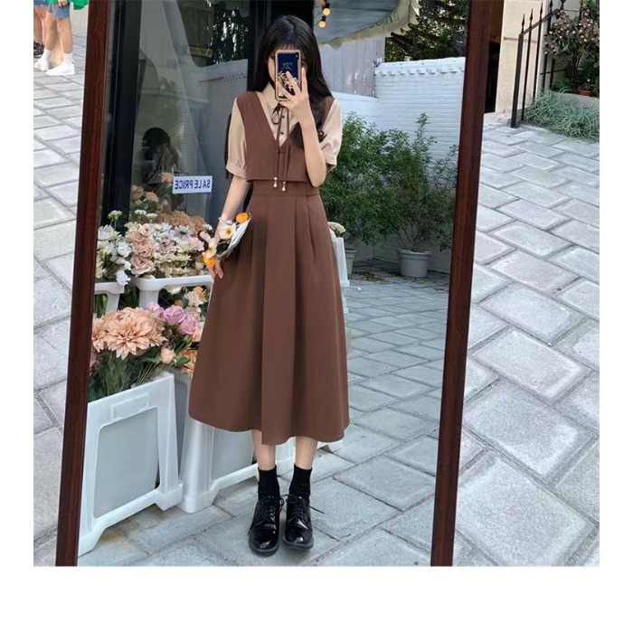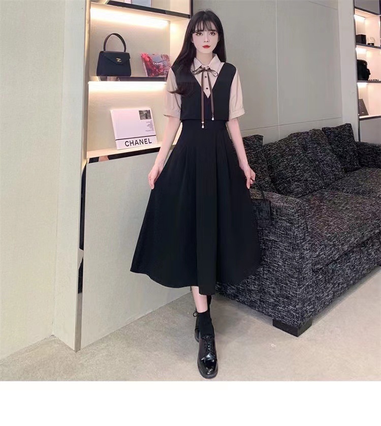 夏季学院风遮肉高腰拼接减龄中长裙大码胖mm套装裙假两件连衣裙女