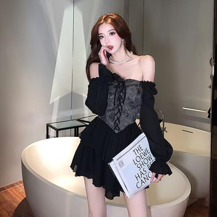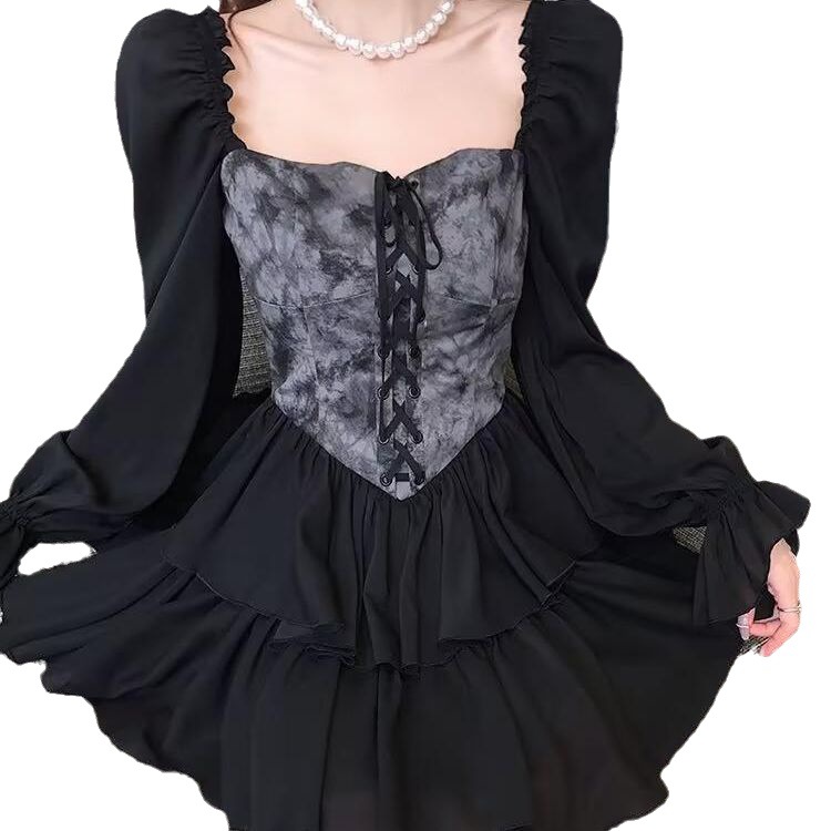春秋季小众显瘦新款烟幕玫瑰复古一字肩两穿扎染宫廷蓬蓬裙