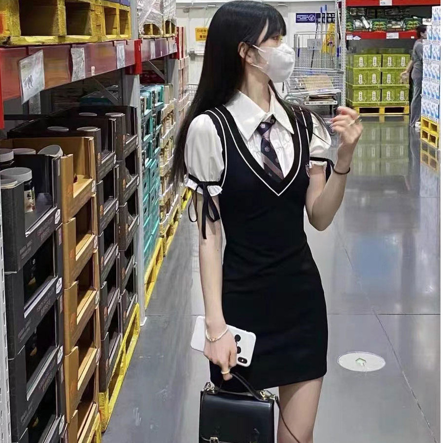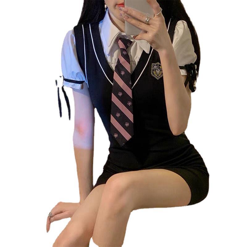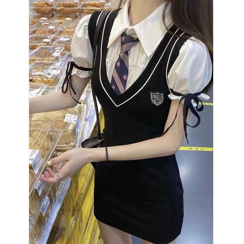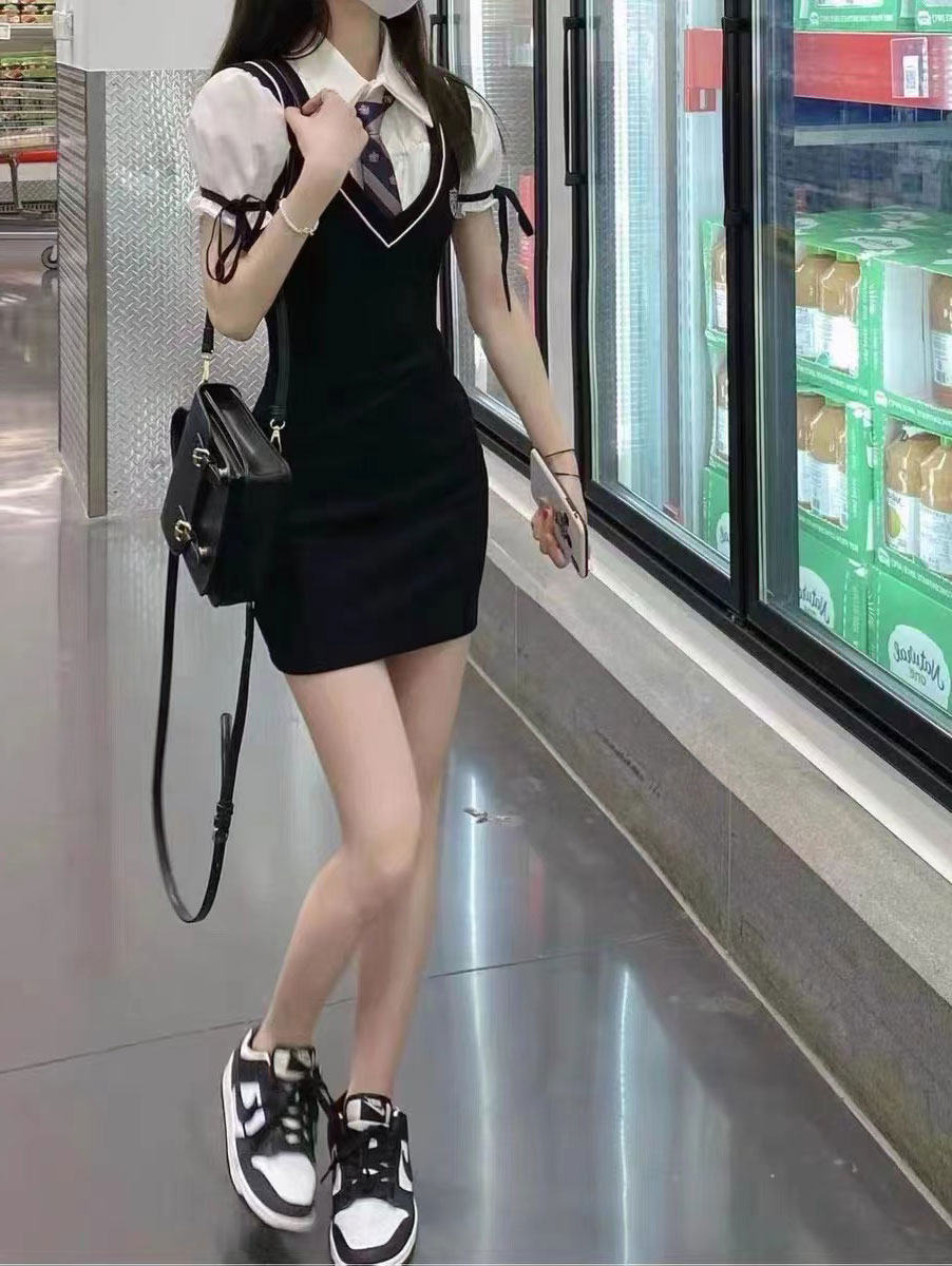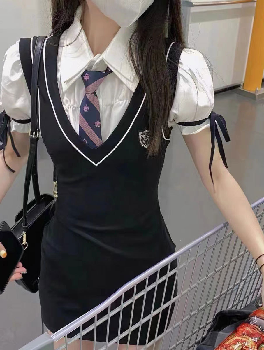 学院风甜酷辣妹高级感御姐包臀泡泡袖连衣裙JK制服假两件纯欲风