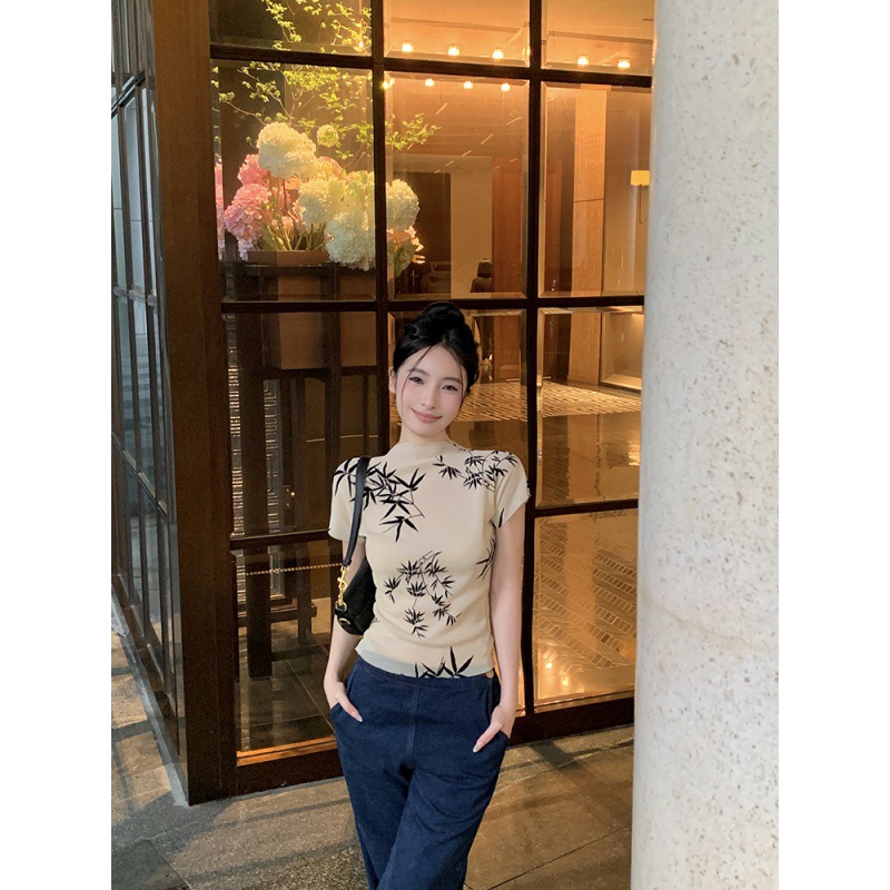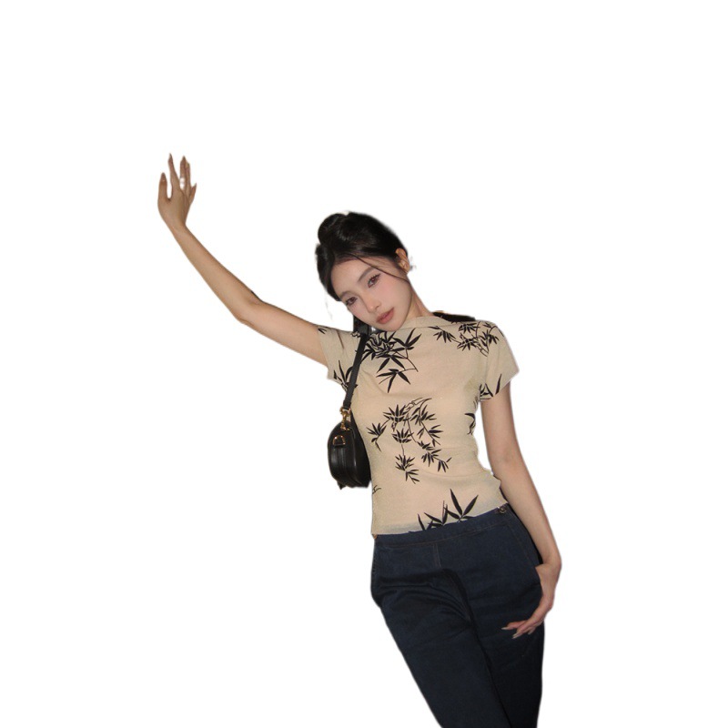 新中式辣妹国风水墨印花弹力微透圆领短袖T恤女上衣