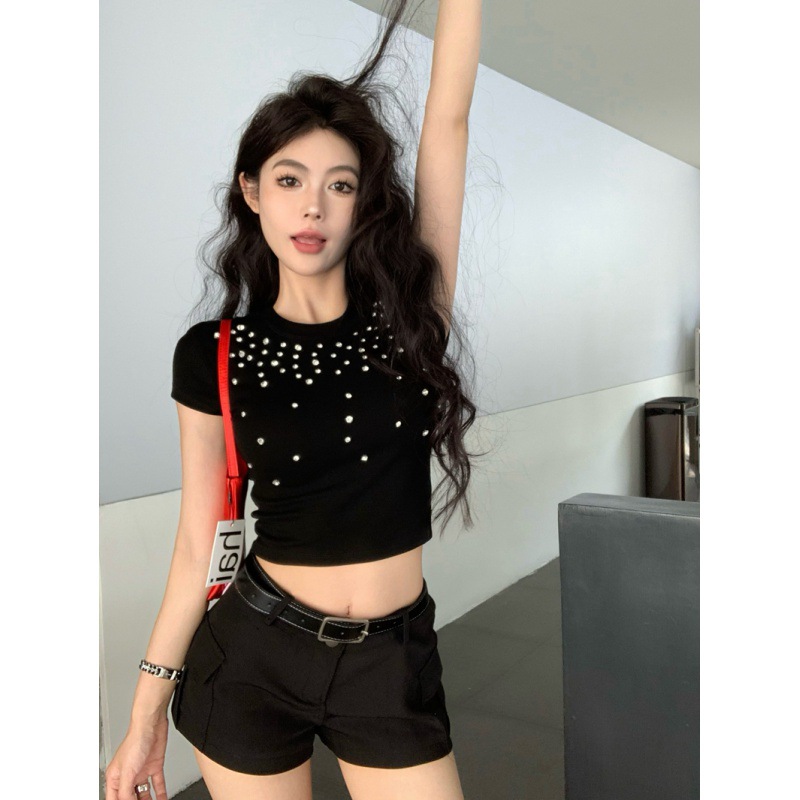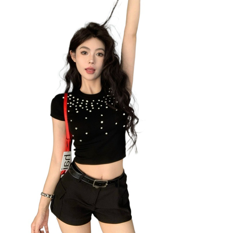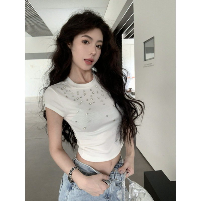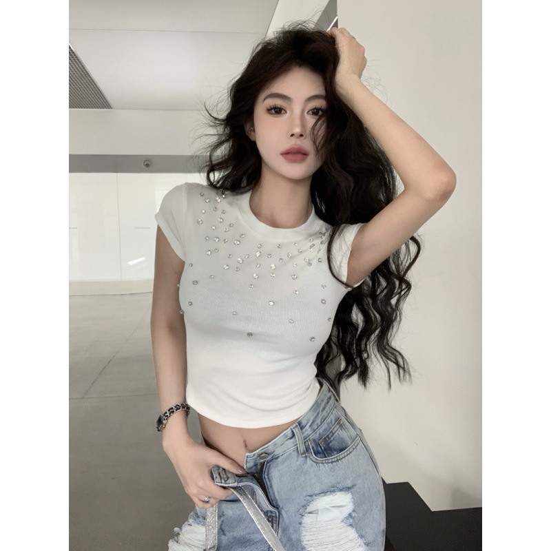 纯欲性感辣妹风闪闪镶钻螺纹短袖正肩短款露脐T恤女上衣