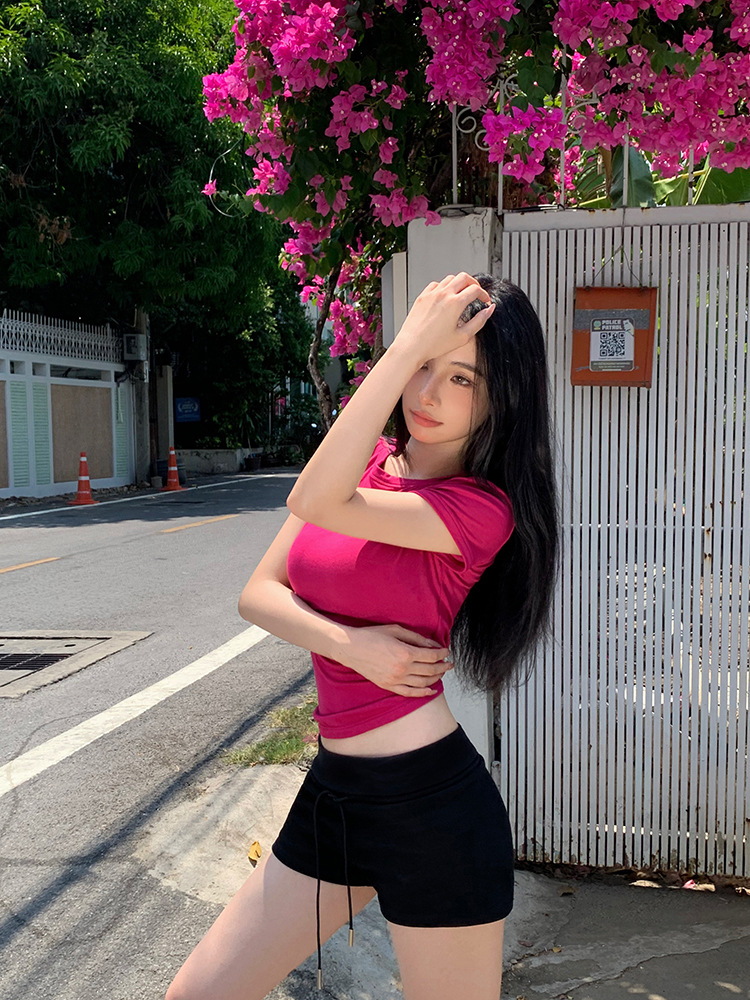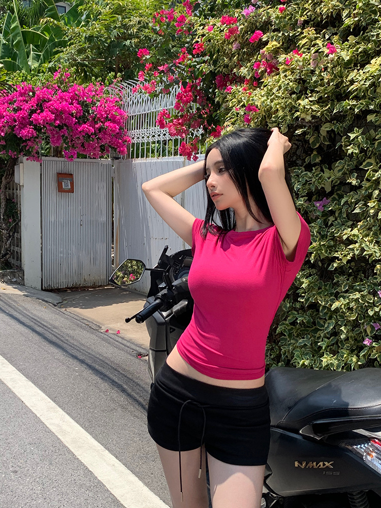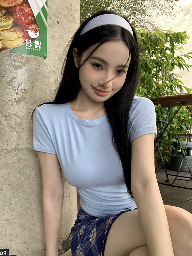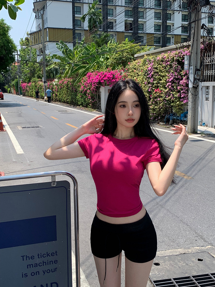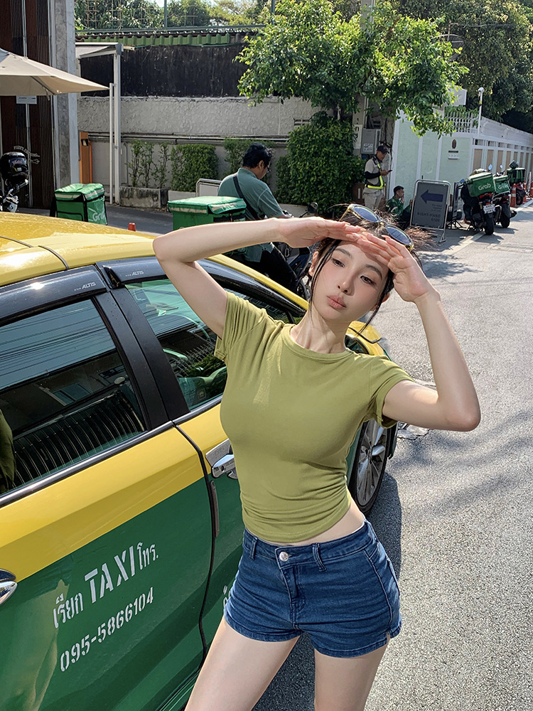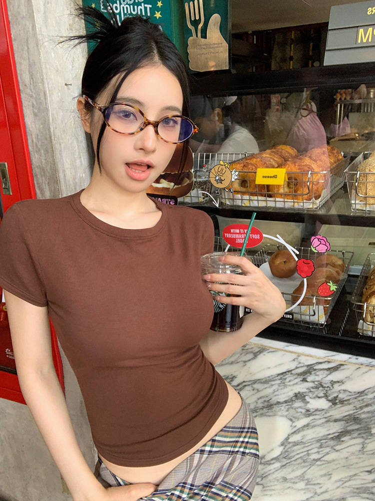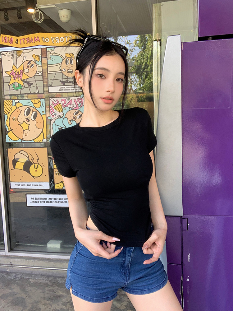 美式辣妹基础纯色修身显瘦正肩小圆领短袖T恤女上衣