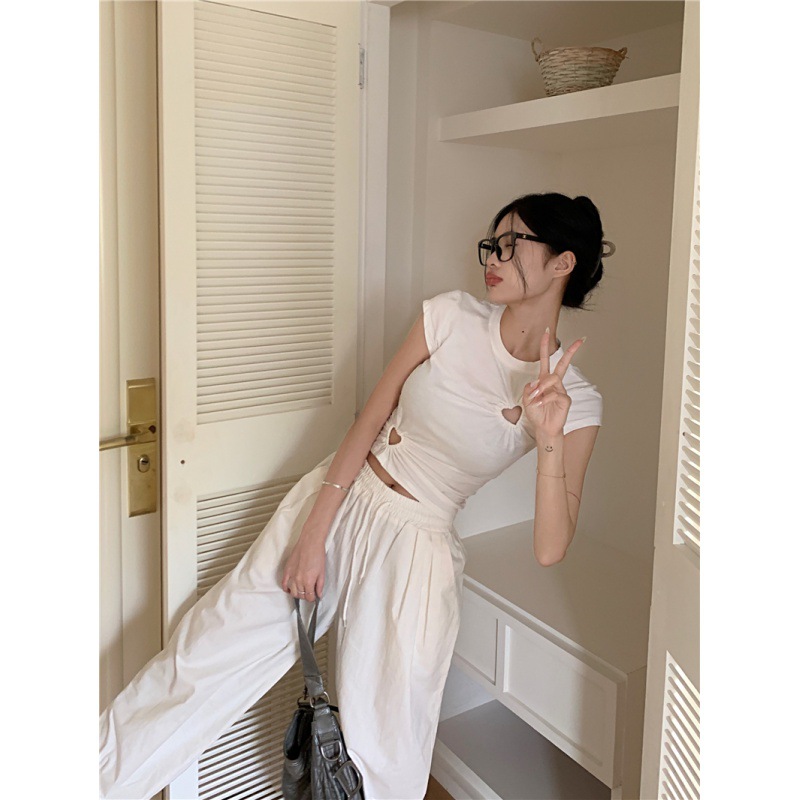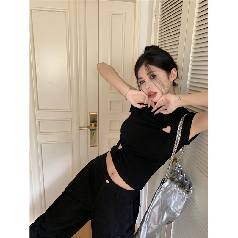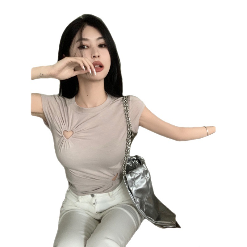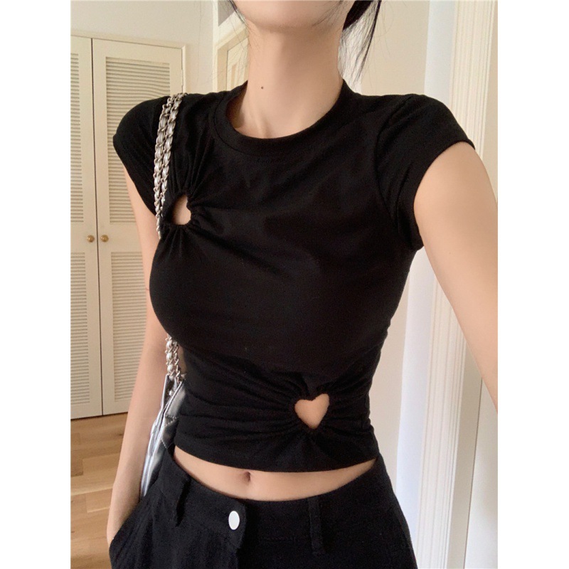 夏季新款纯欲性感甜辣设计感爱心镂空修身短款短袖T恤女上衣