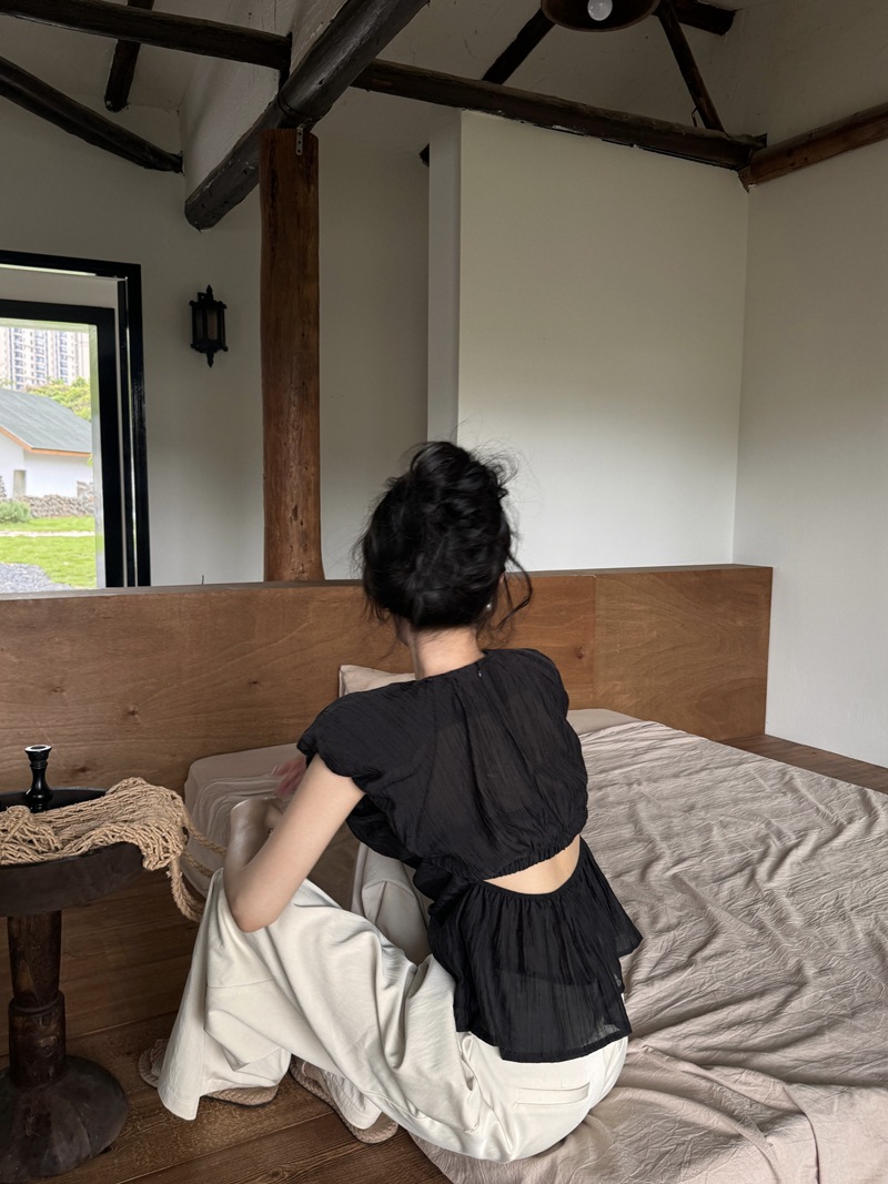 夏季法式气质圆领泡泡袖收腰娃娃衫小心机露腰褶皱无袖上衣