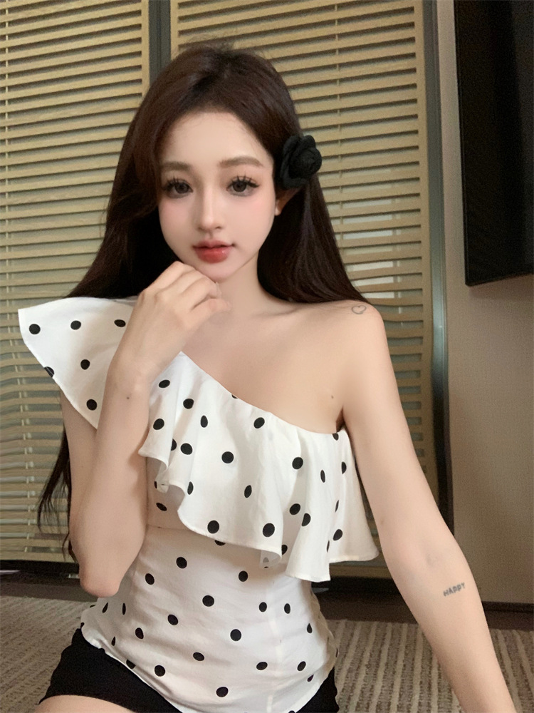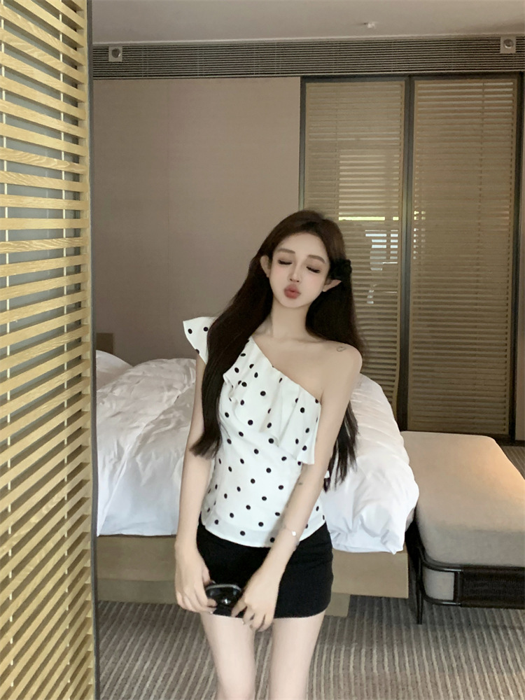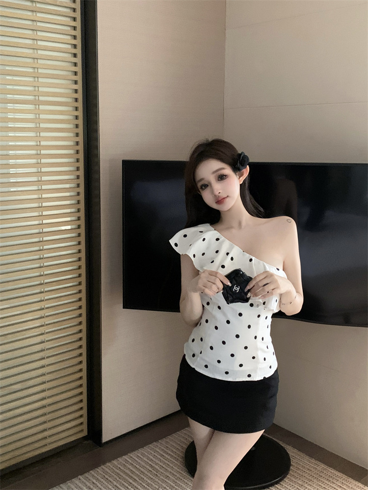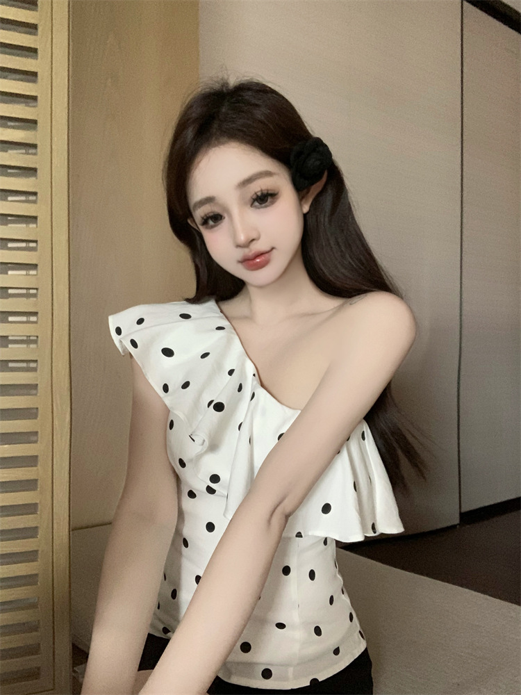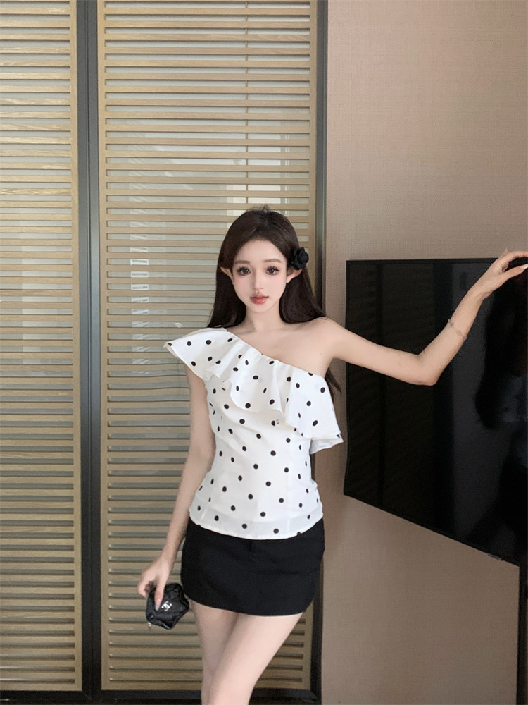 波点荷叶边斜肩衬衫女不规则一字肩衬衣上衣