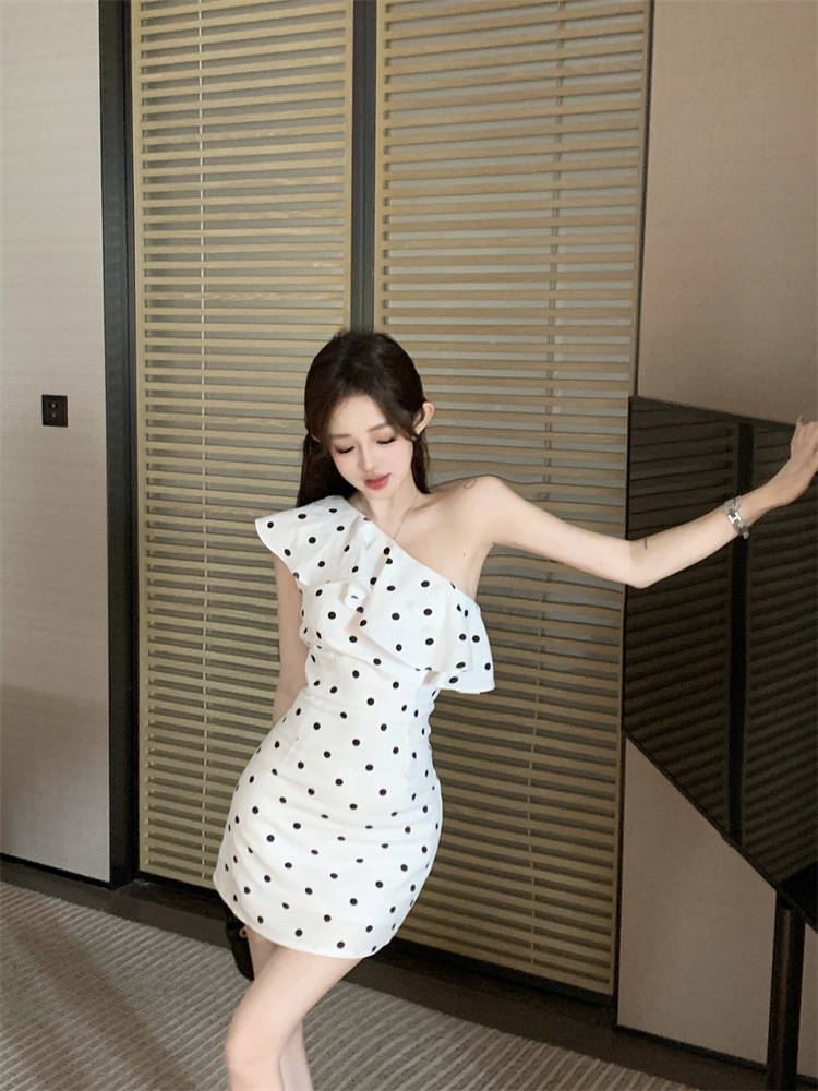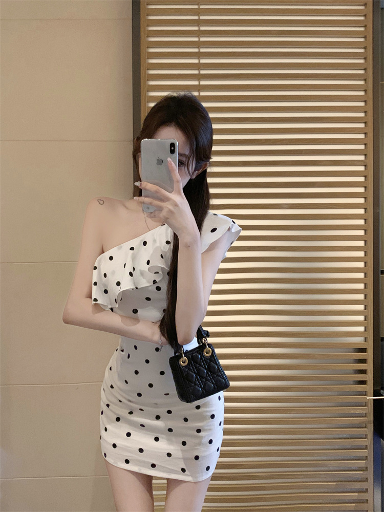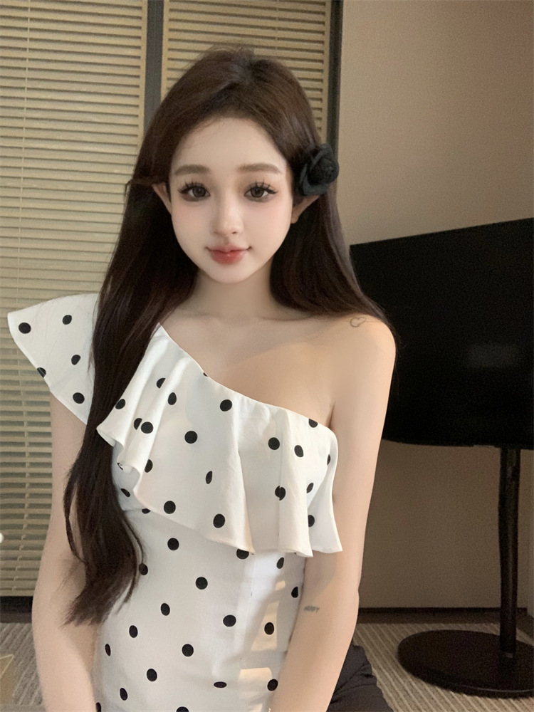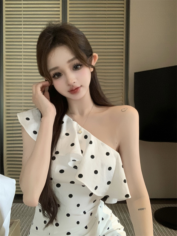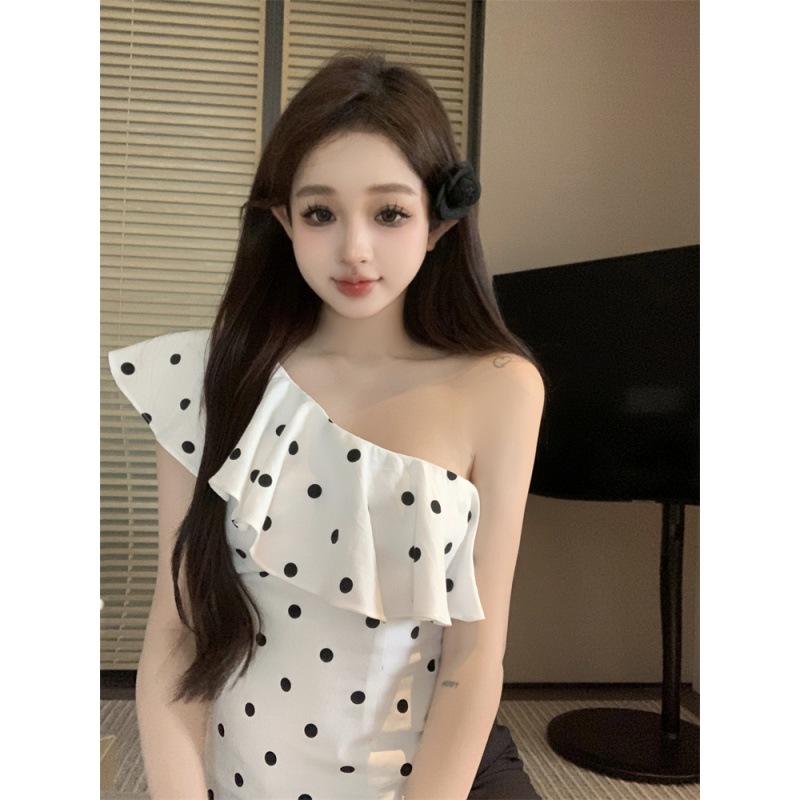 波点荷叶边斜肩衬衫女不规则一字肩衬衣上衣