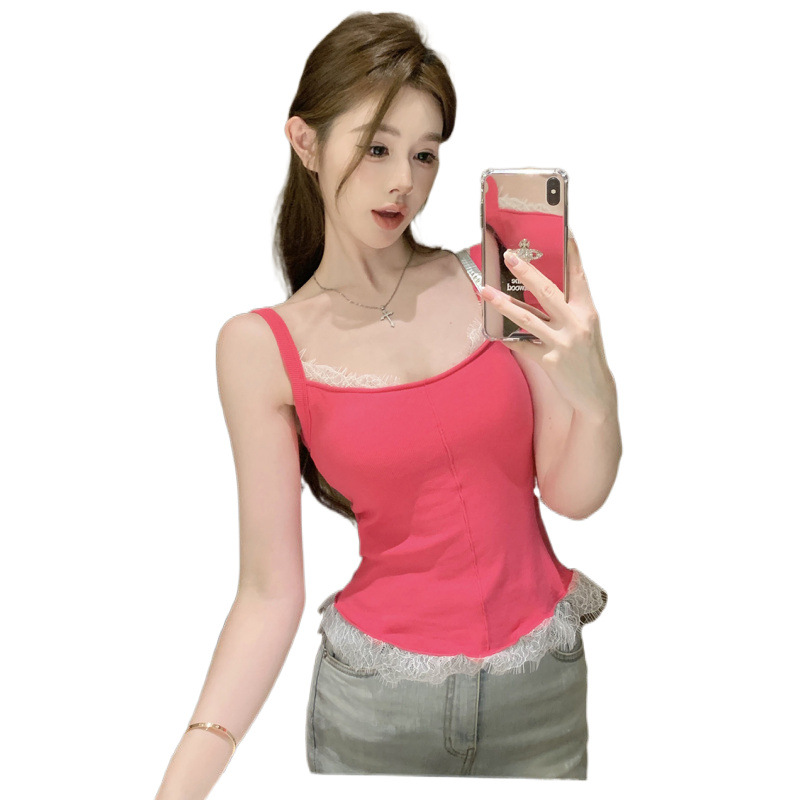 纯欲性感辣妹蕾丝拼接针织吊带背心带胸垫打底上衣女
