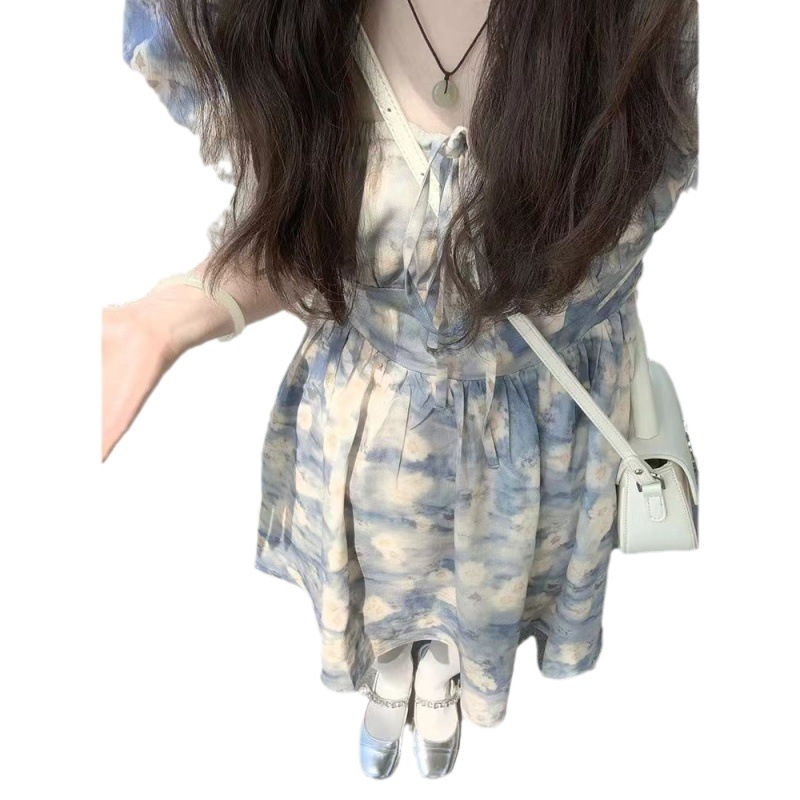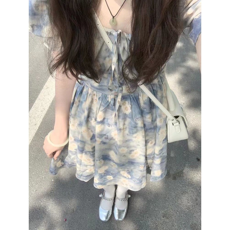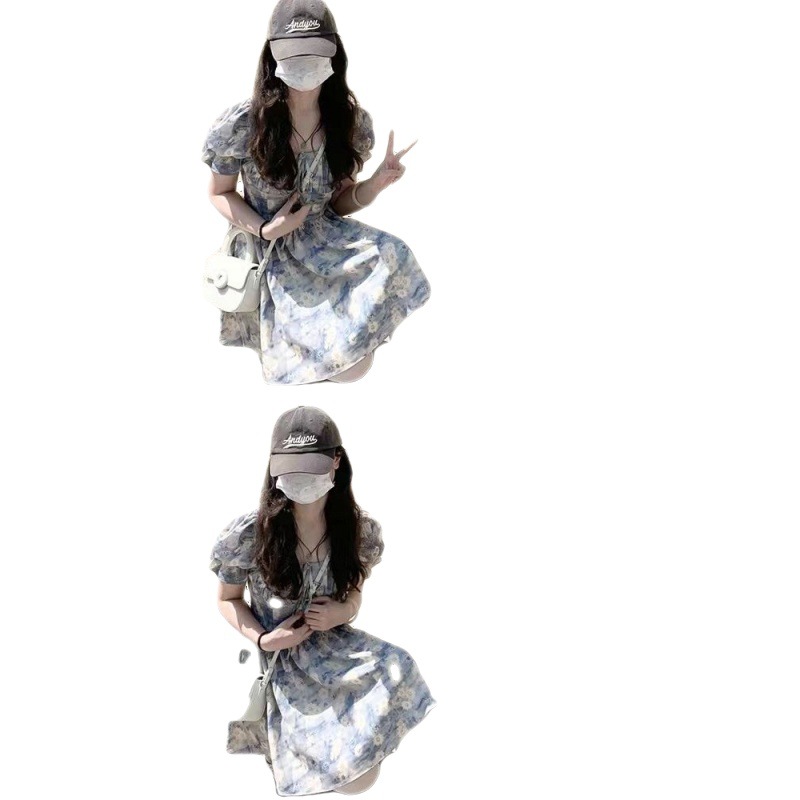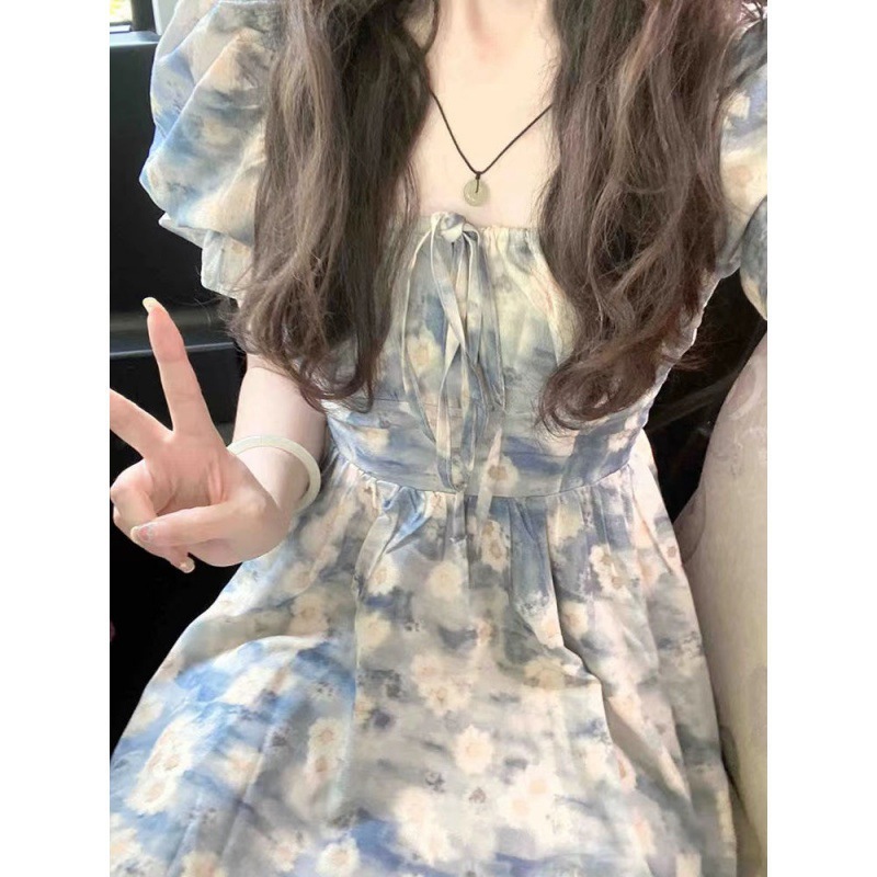 蓝色碎花连衣裙夏海边度假法式泡泡袖抽绳褶皱收腰显瘦小个子短裙