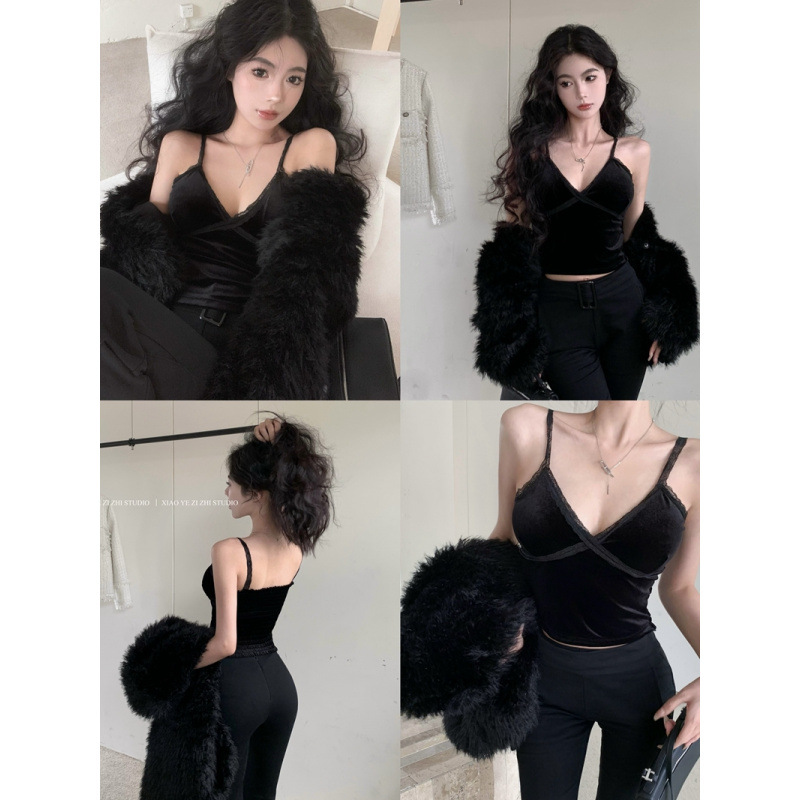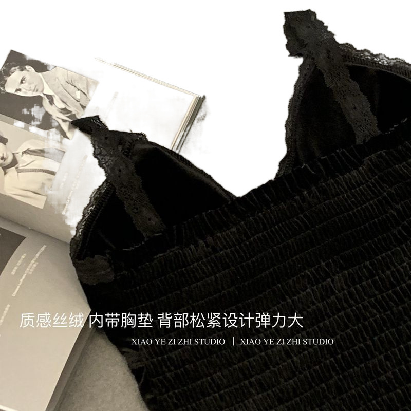 法式自带胸垫蕾丝吊带网红背心女纯欲内搭丝绒抹胸上衣
