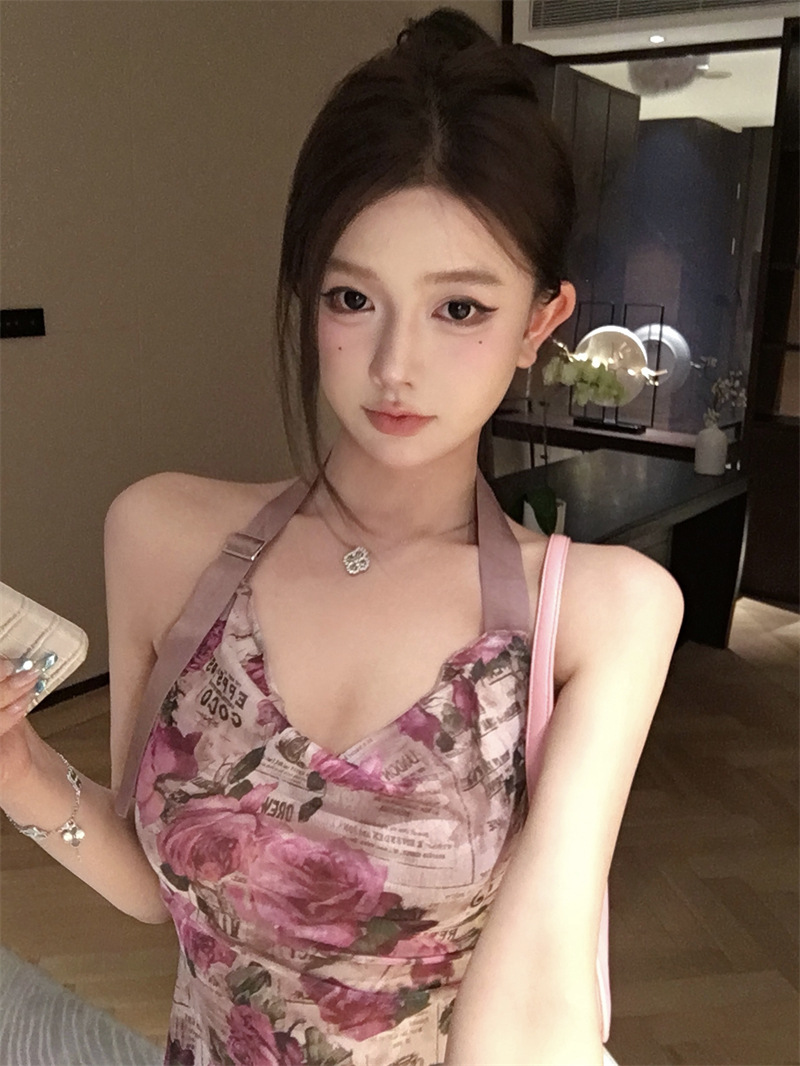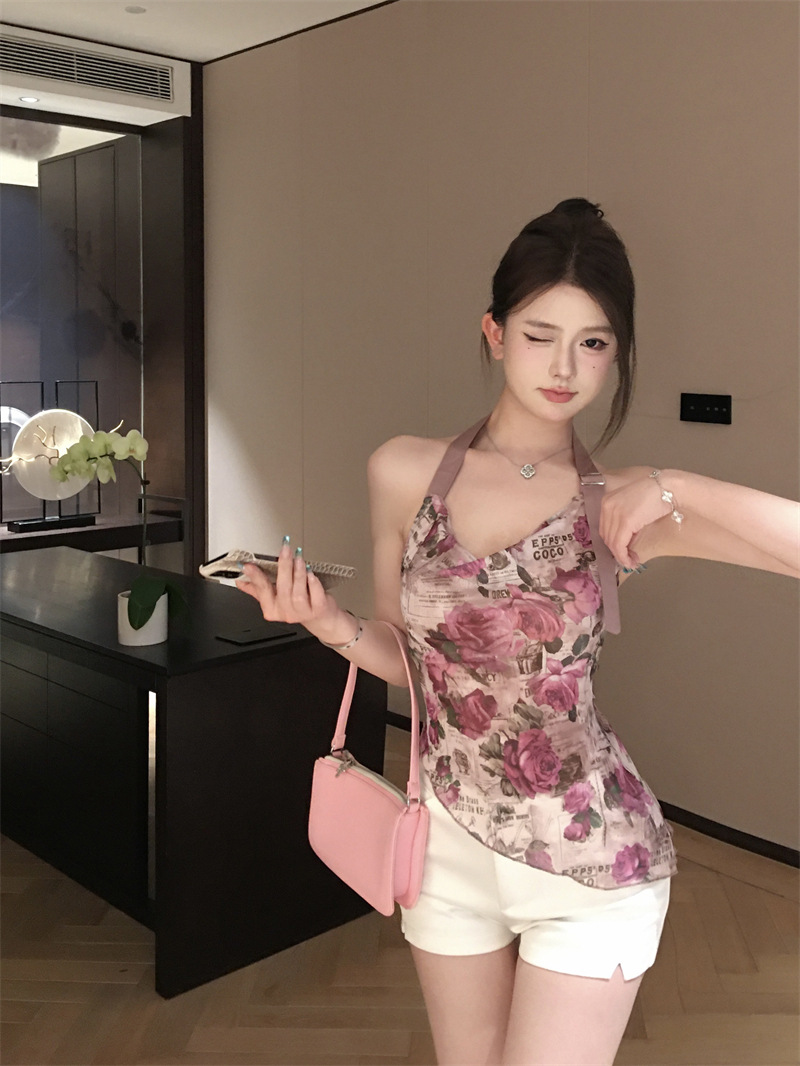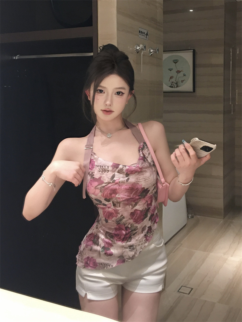 夏季新款纯欲性感辣妹挂脖雪纺碎花修身薄吊带背心女上衣