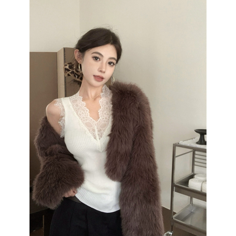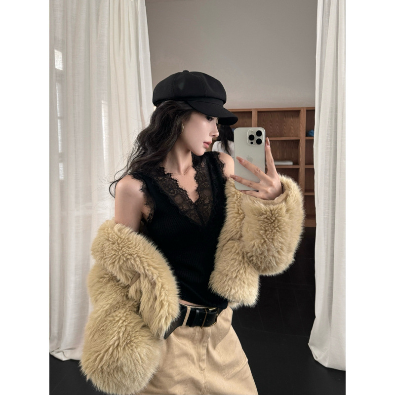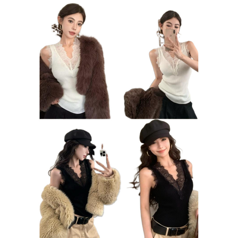 性感辣妹风领蕾丝花边针织背心女无袖内搭打底衫