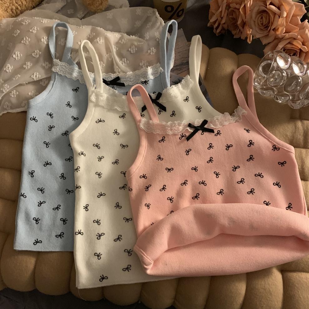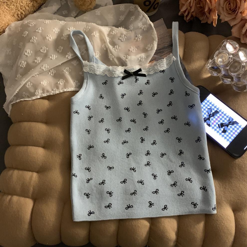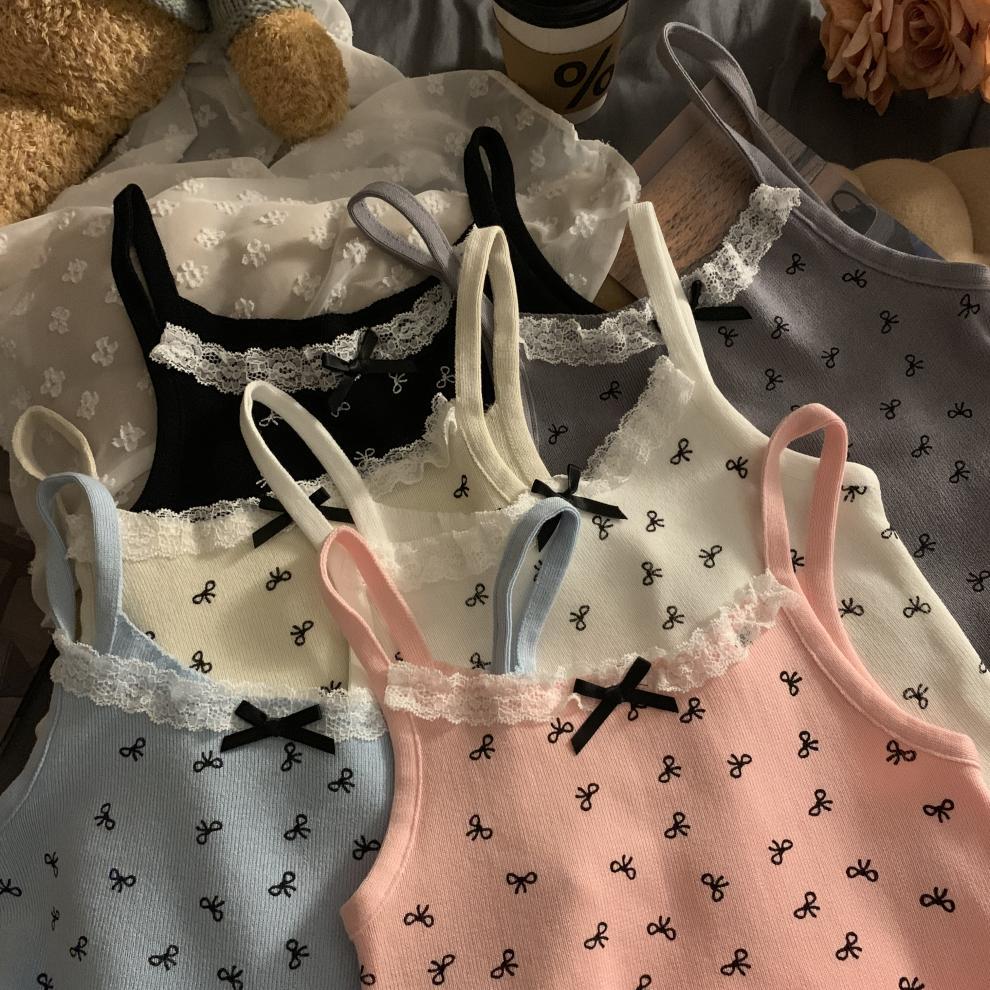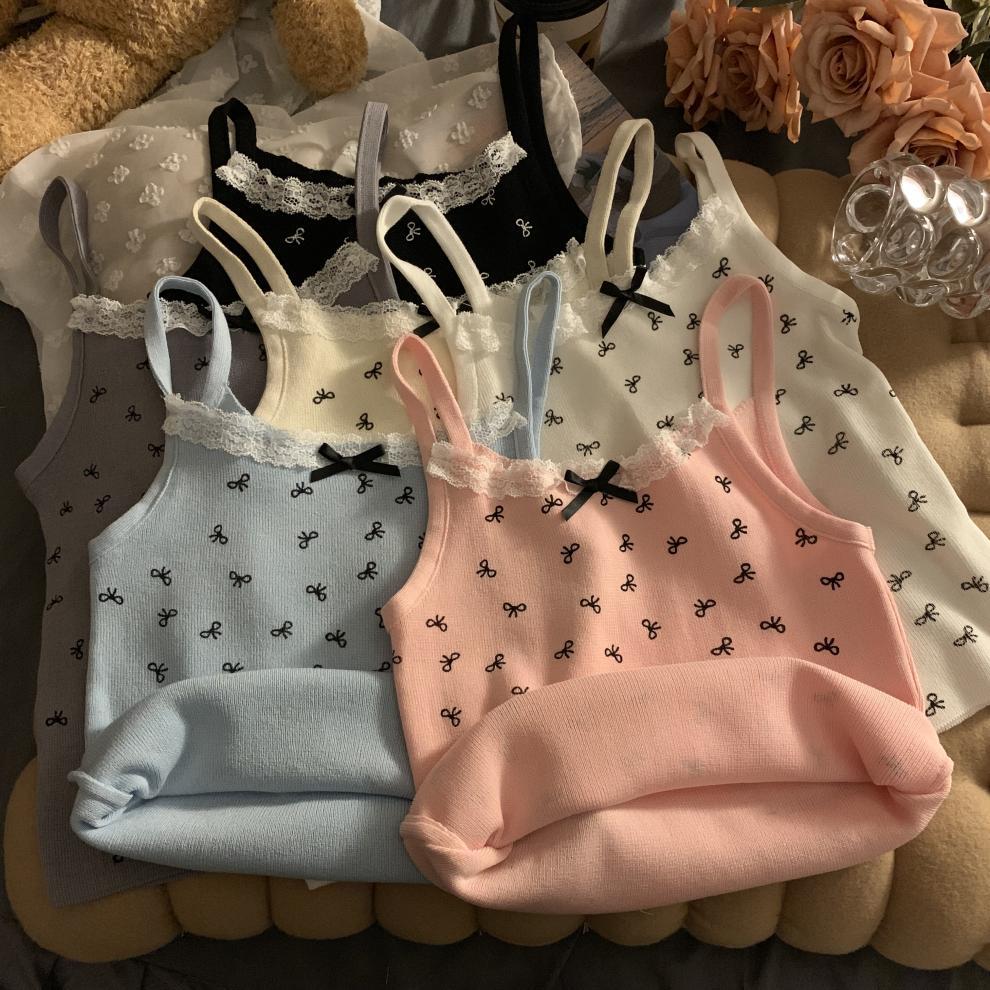 甜美风蕾丝边蝴蝶结吊带背心女弹性修身短款上衣