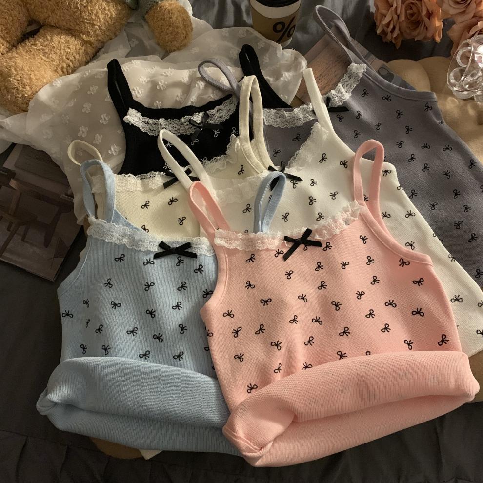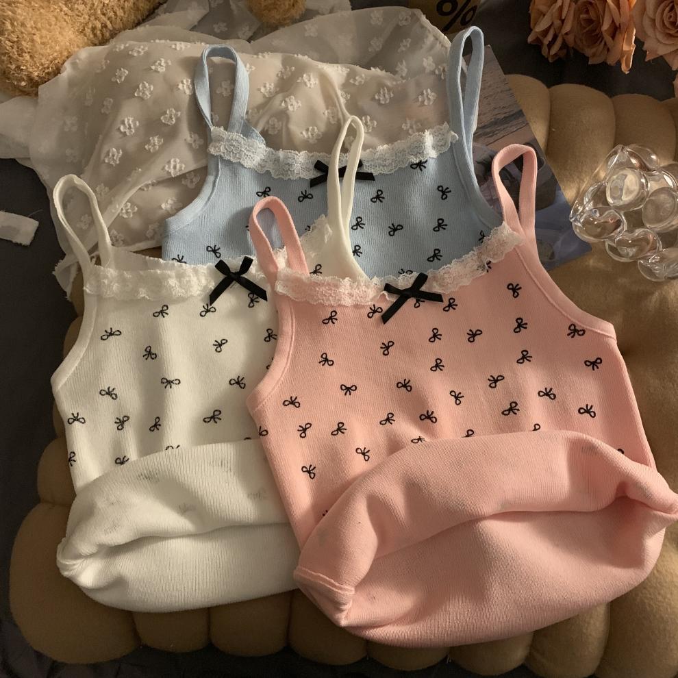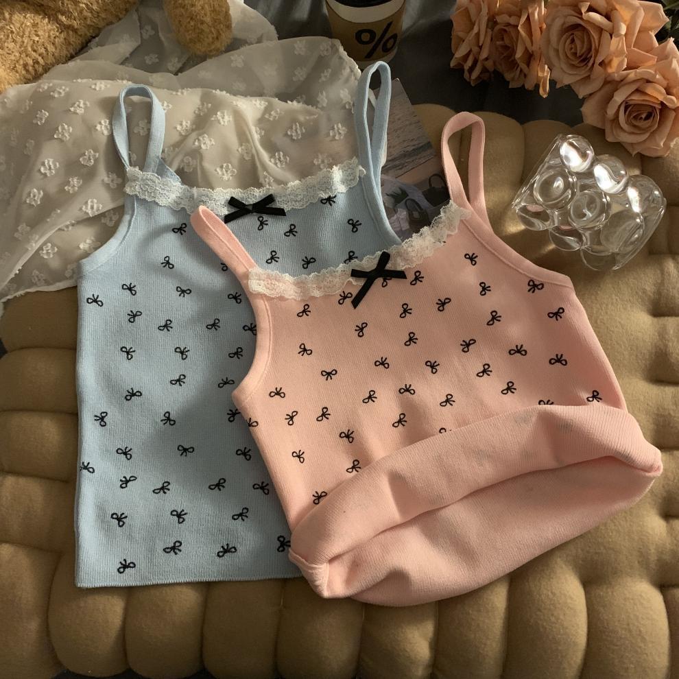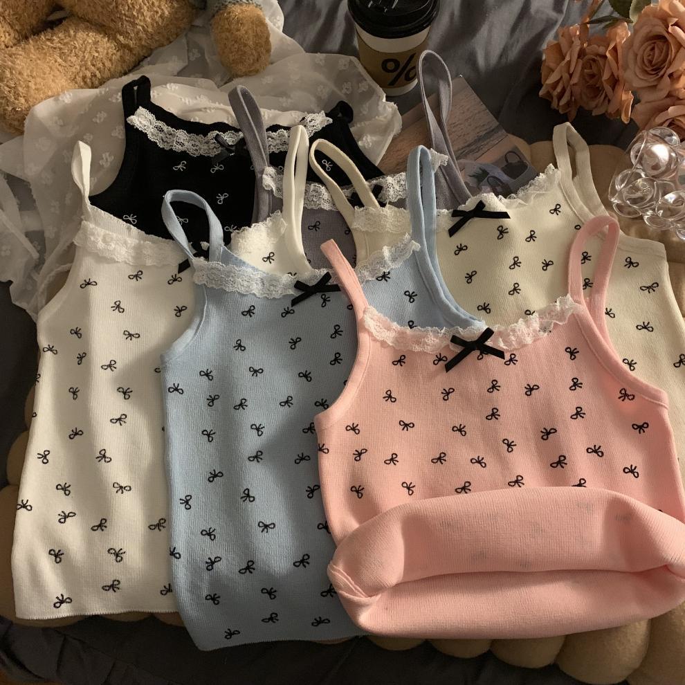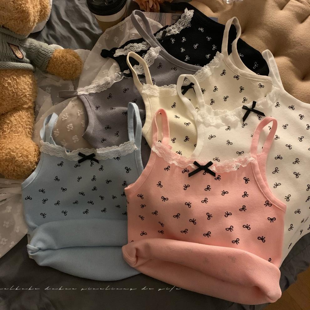 甜美风蕾丝边蝴蝶结吊带背心女弹性修身短款上衣