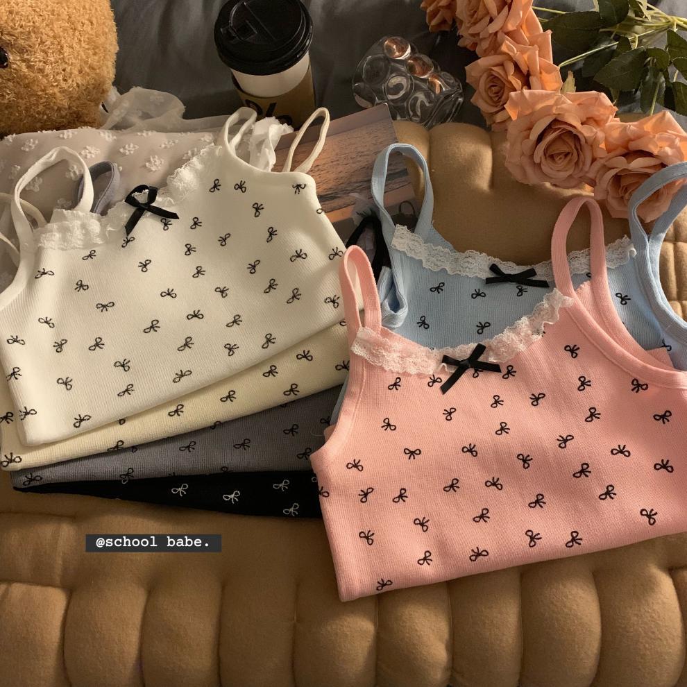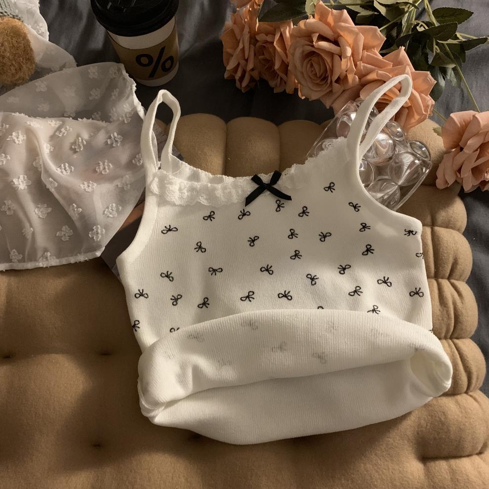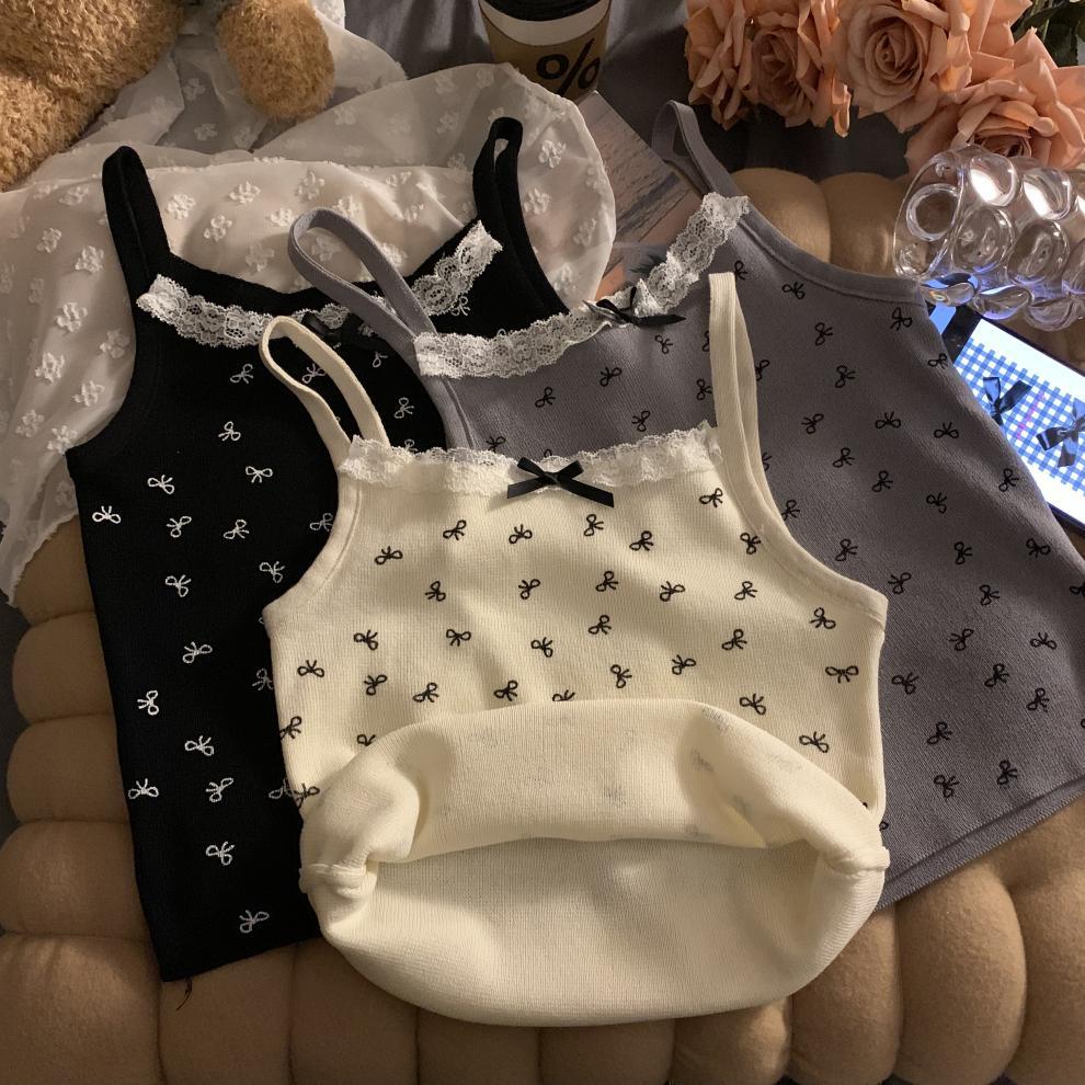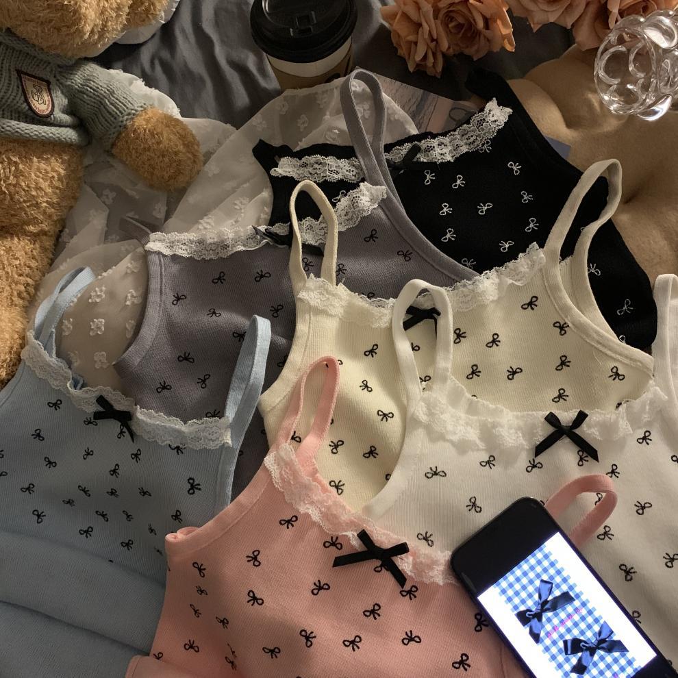 甜美风蕾丝边蝴蝶结吊带背心女弹性修身短款上衣