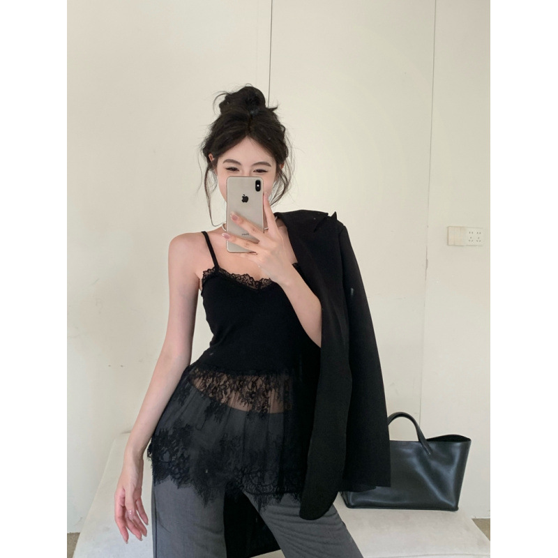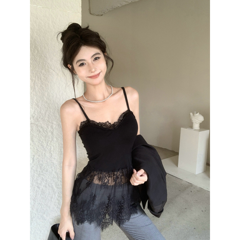 纯欲性感辣妹风叠穿内搭带胸垫蕾丝背心打底中长款上衣