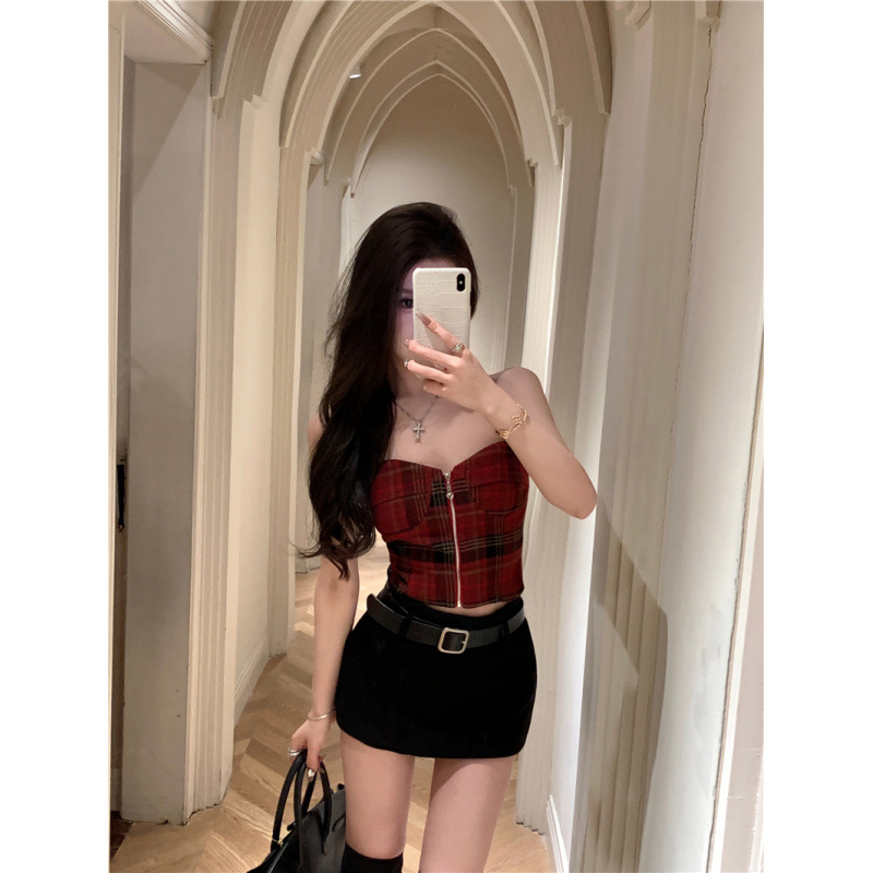 辣妹格纹撞色性感鹿皮绒毛呢拉链抹胸上衣