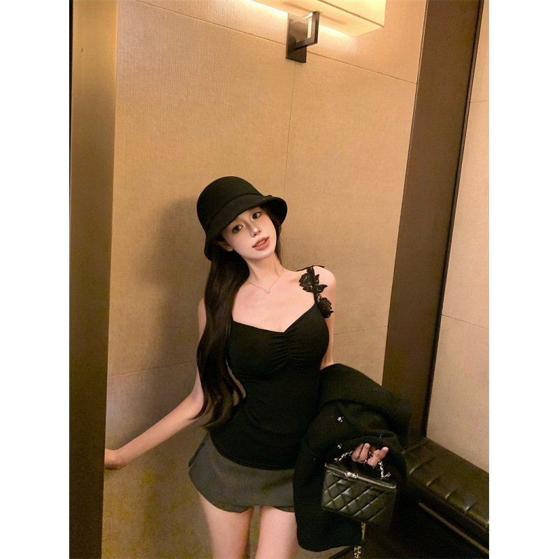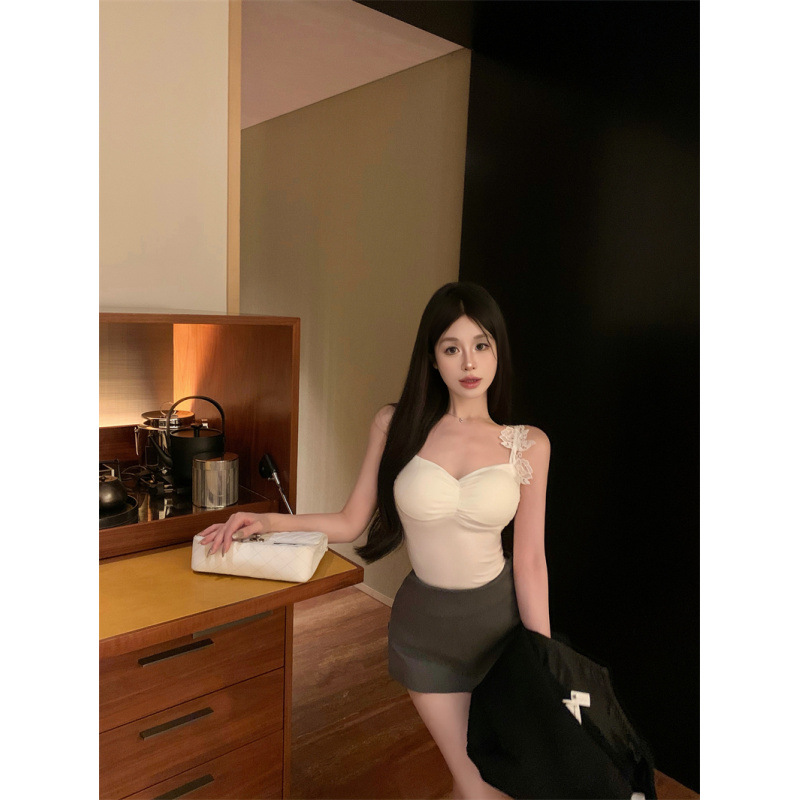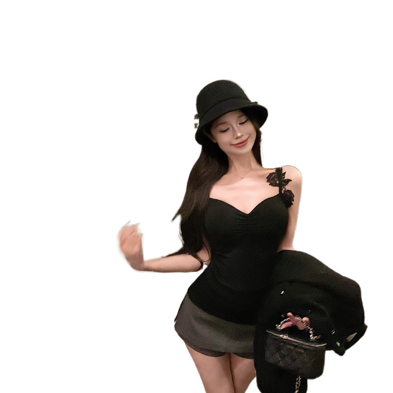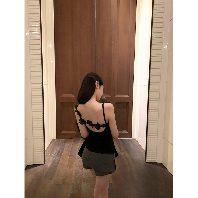 后背镂空设计感不规则蕾丝肩带吊带打底外穿上衣带胸棉