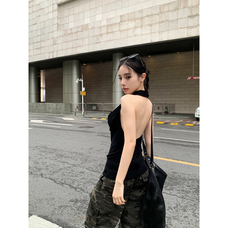 纯欲性感两穿轻薄后背镂空修身短款挂脖针织背心女上衣