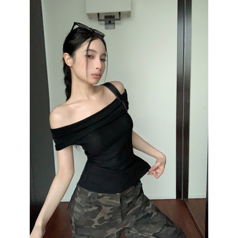 设计感露肩灰色短袖T恤女夏季宽松休闲斜肩黑色上衣