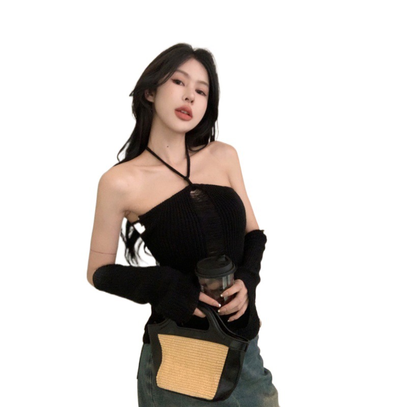针织袖套挂脖吊带背心女镂空设计感性感露背上衣