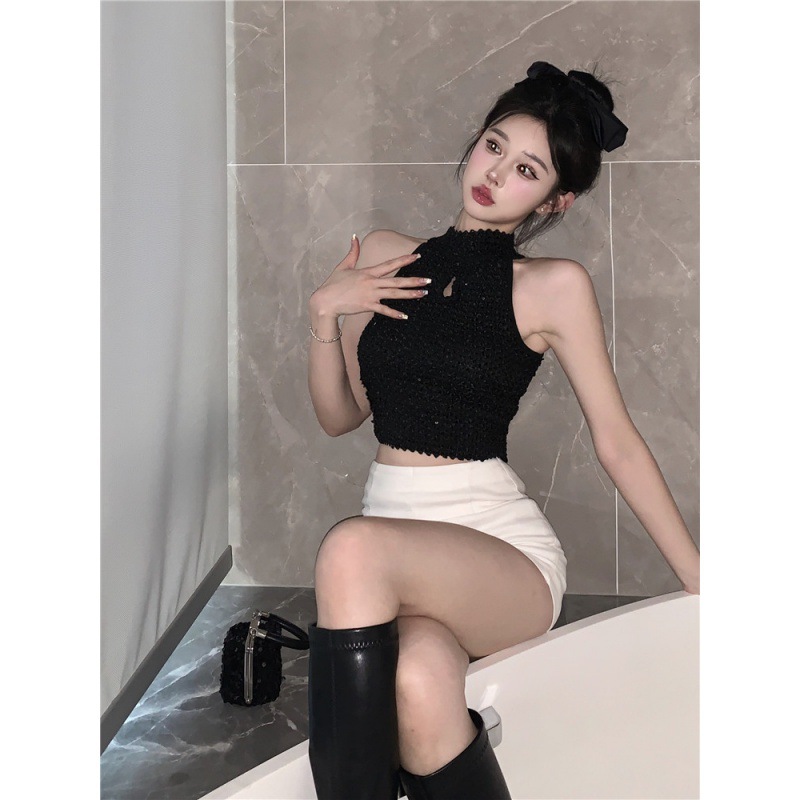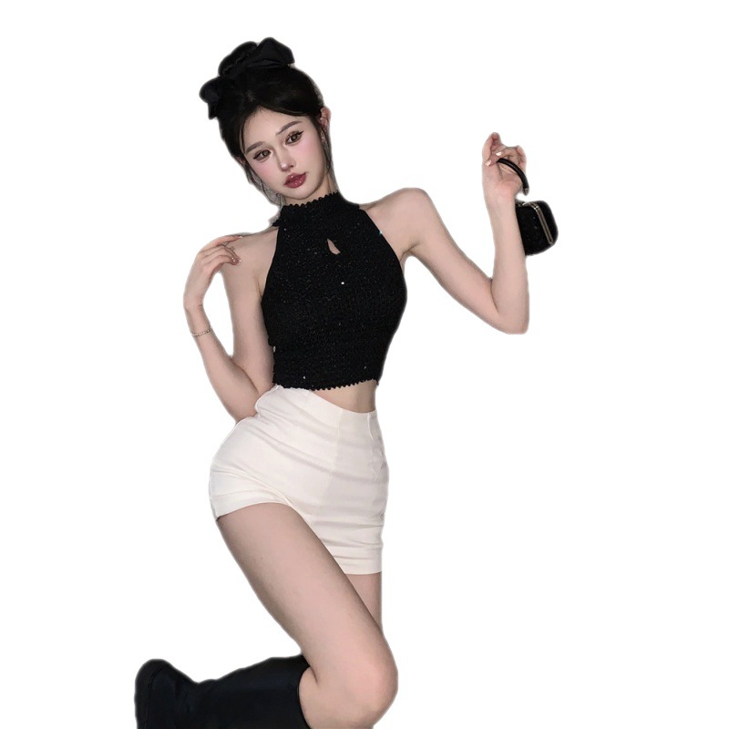 夏季新款甜辣小香风重工亮片褶皱气质名媛露肩挂脖背心女上衣