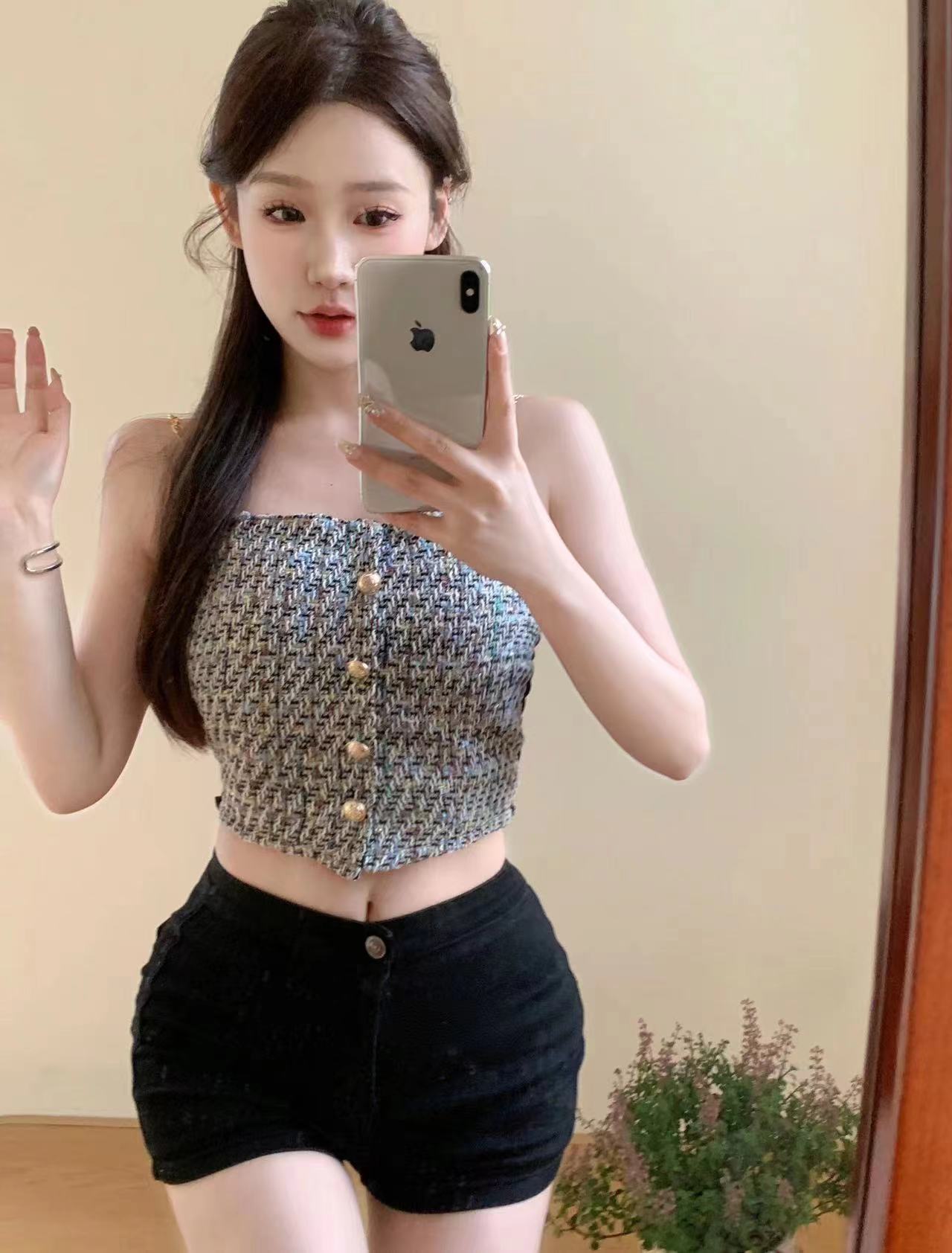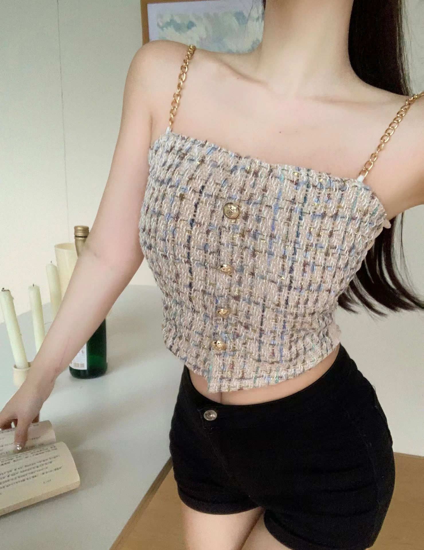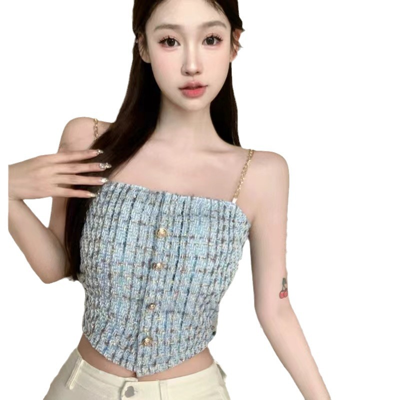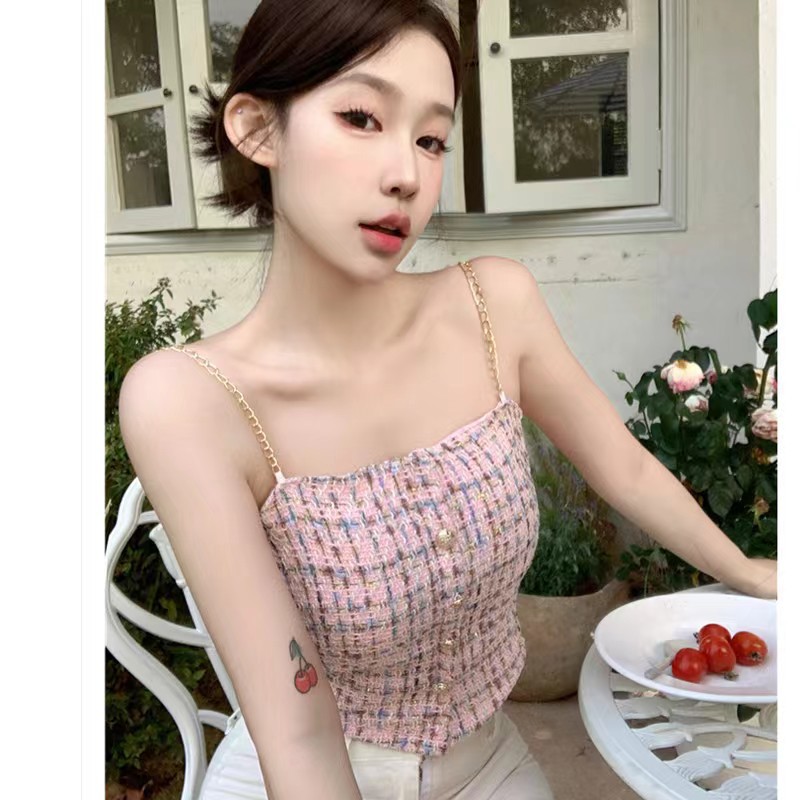 甜妹小香风链条小吊带背心女夏季纽扣一字领时尚抹胸百搭外穿上衣