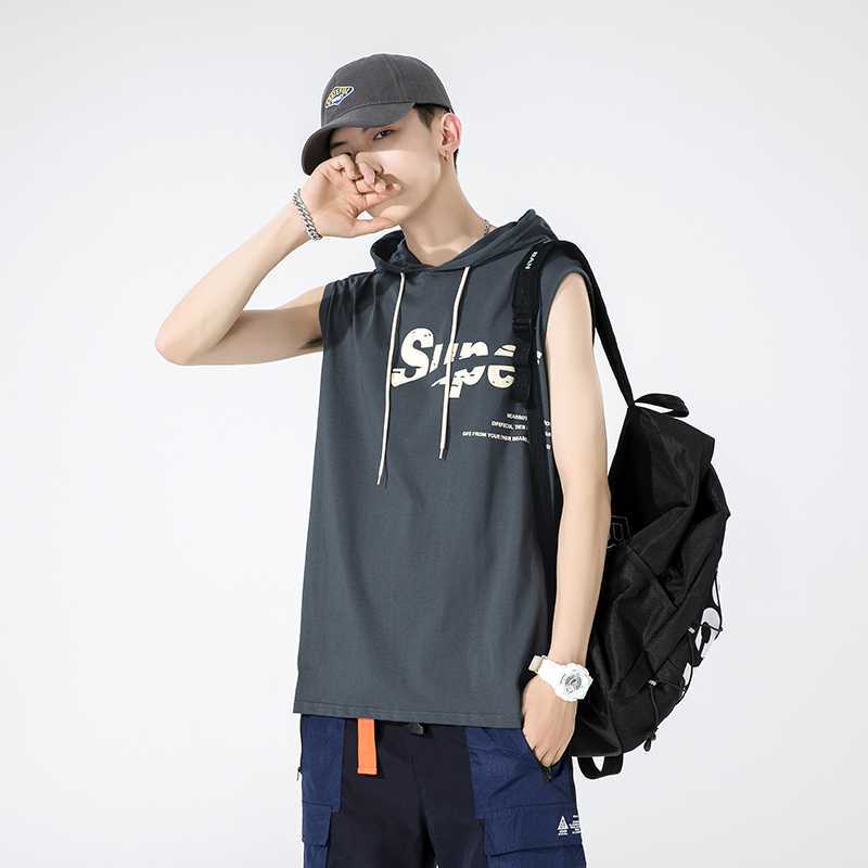 夏季背心男士无袖恤连帽潮流运动健身坎肩薄款连帽外穿简约