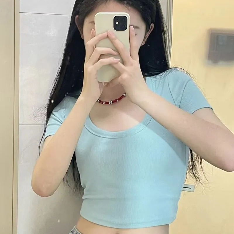 baby蓝正肩圆领短袖t恤女夏季短款高腰露脐修身显瘦T恤上衣服潮