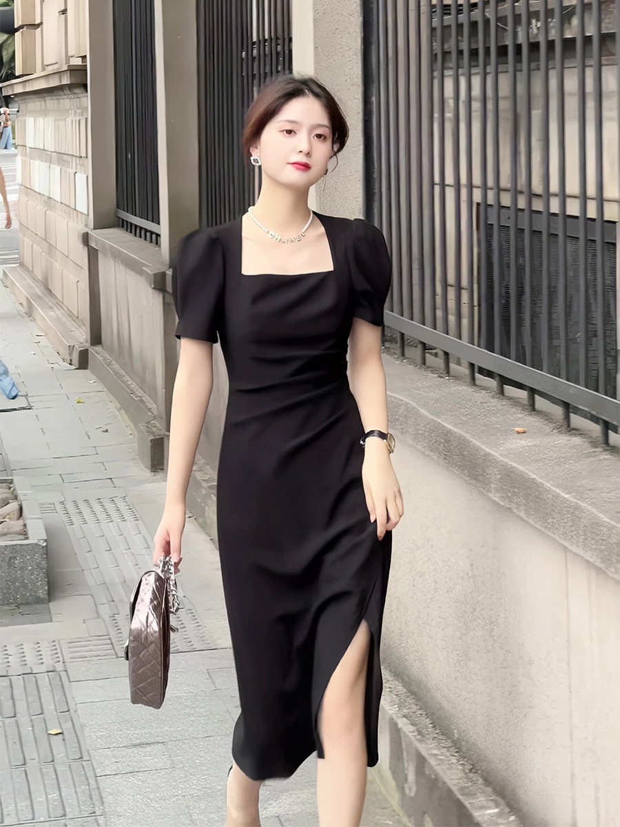 法式赫本风黑色连衣裙春夏季新款高级感修身显瘦气质开叉裙子