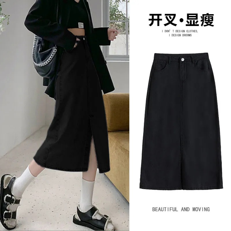 a字开叉黑色牛仔半身裙中长款高腰显瘦百搭宽松学生梨形大码长裙