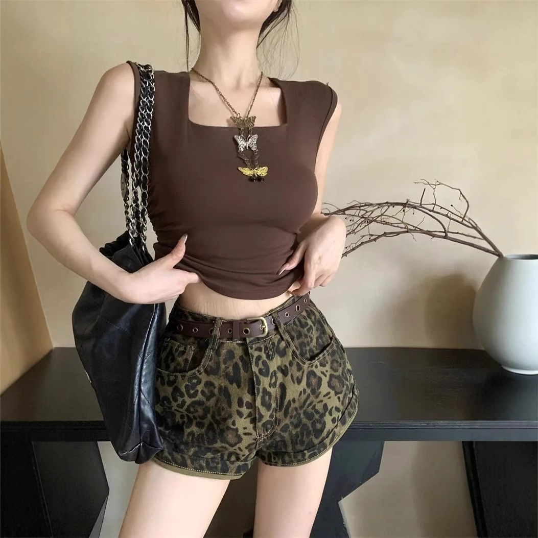 美式复古水洗辣妹豹纹短裤女高街废土风显瘦直筒阔腿包臀热裤子潮