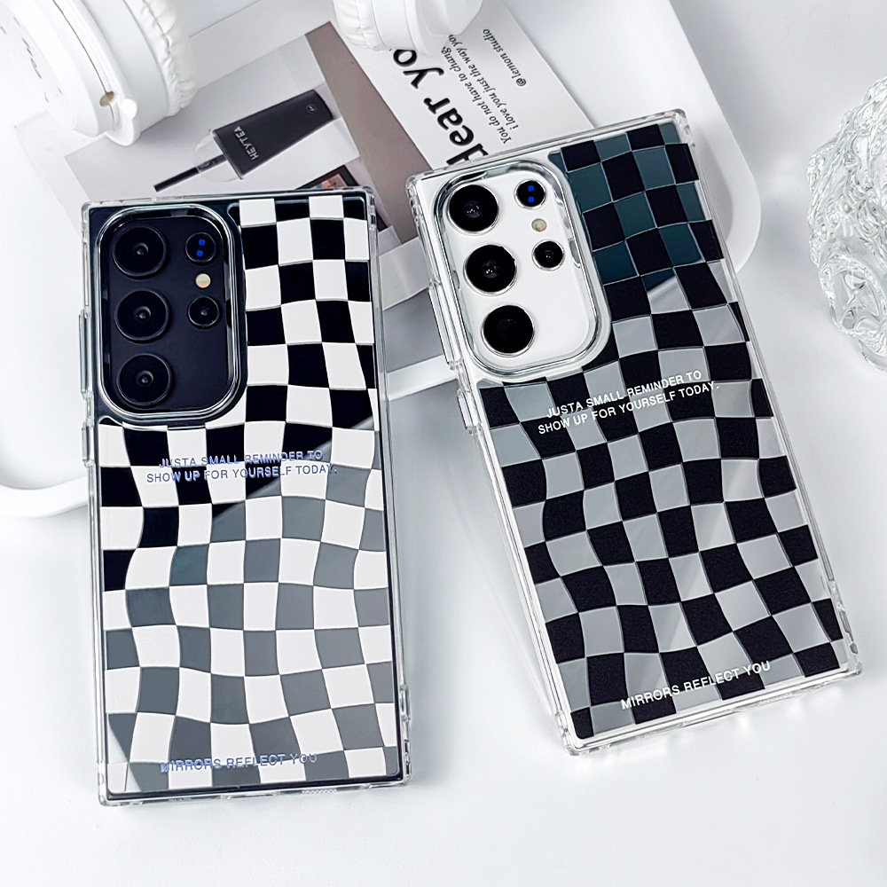 复古黑白镜面棋盘格子S23Ultra手机壳S21FE防震A32简约S24情侣A13