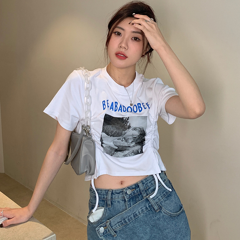韩版设计感侧边抽绳辣妹正肩上衣女美式印花修身显瘦短款短袖T恤