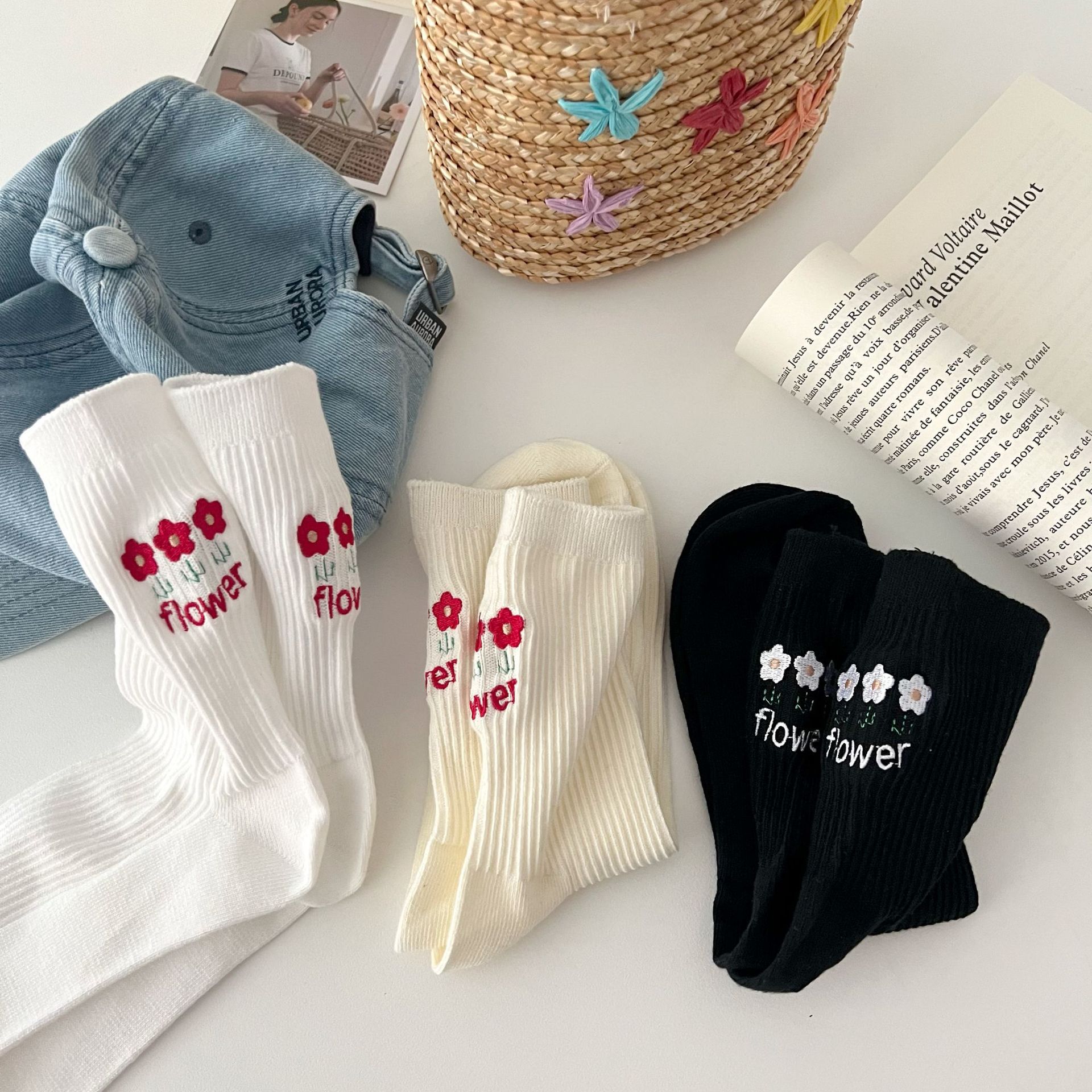 双针花朵刺绣袜子可爱兔子女袜纯棉中筒袜ins日系男女韩版堆堆袜