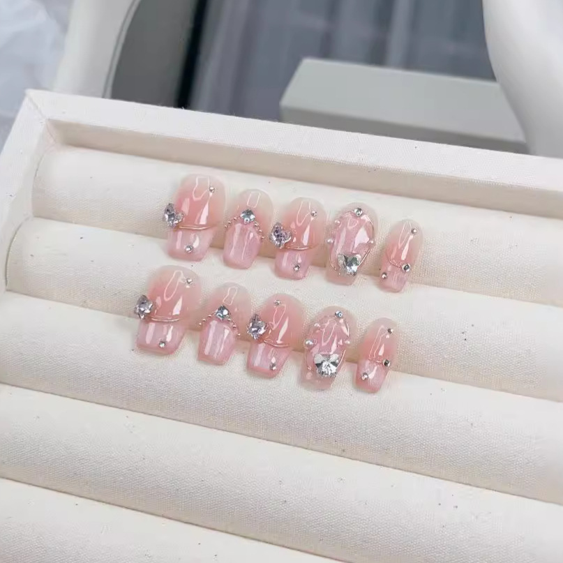 纯手工光疗穿戴甲粉黛佳人裸色百搭款杏仁甲中长梯温柔粉色美甲贴