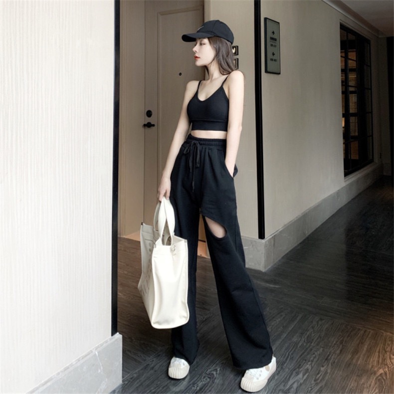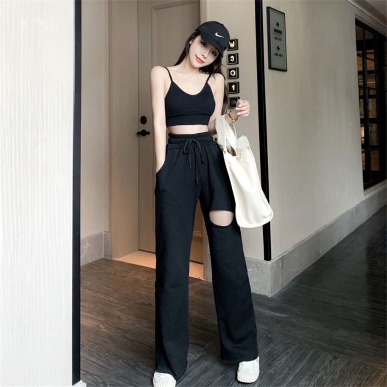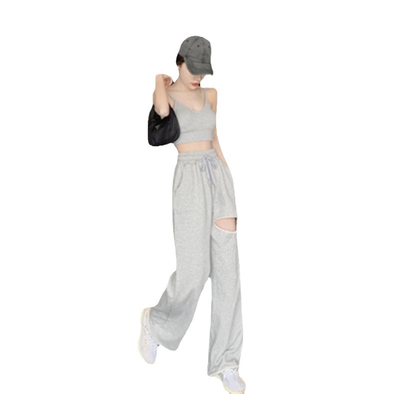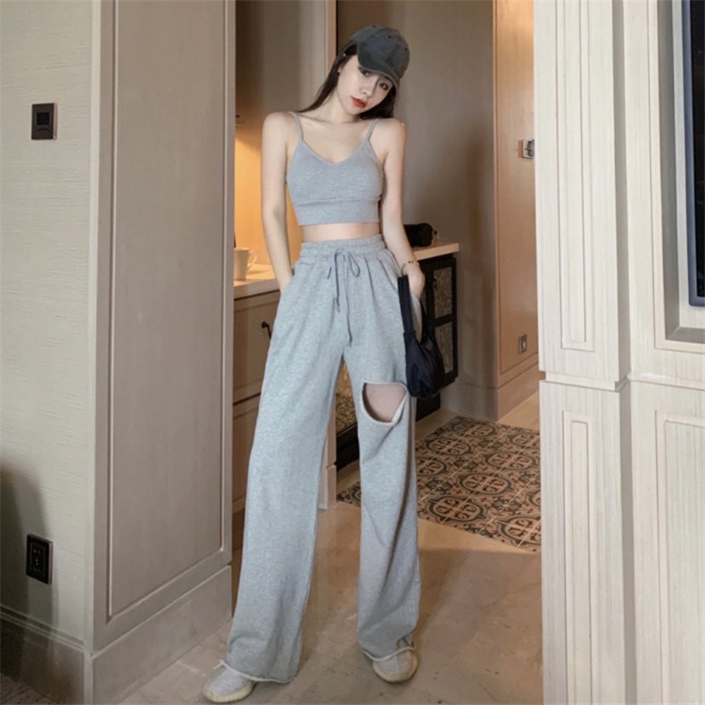 灰色阔腿裤夏女薄款新款高腰宽松休闲裤运动裤高街ins潮破洞