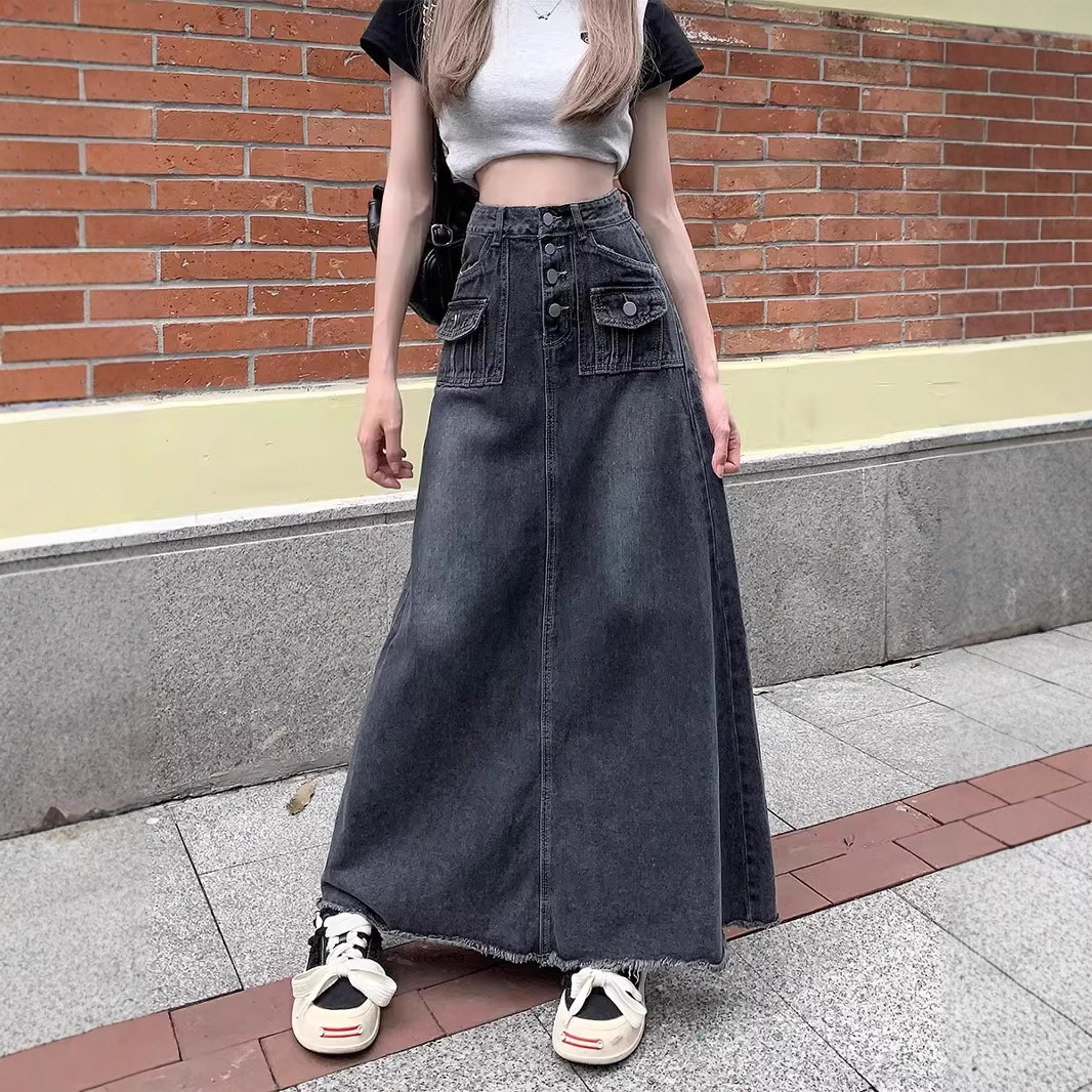 美式复古深蓝色牛仔半身裙女新款小个子A字长裙长款裙子