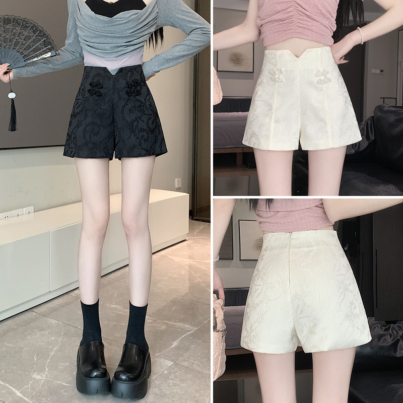 新中式提花盘扣短裤女春夏新款高腰显瘦外穿A字阔腿裤五分裤