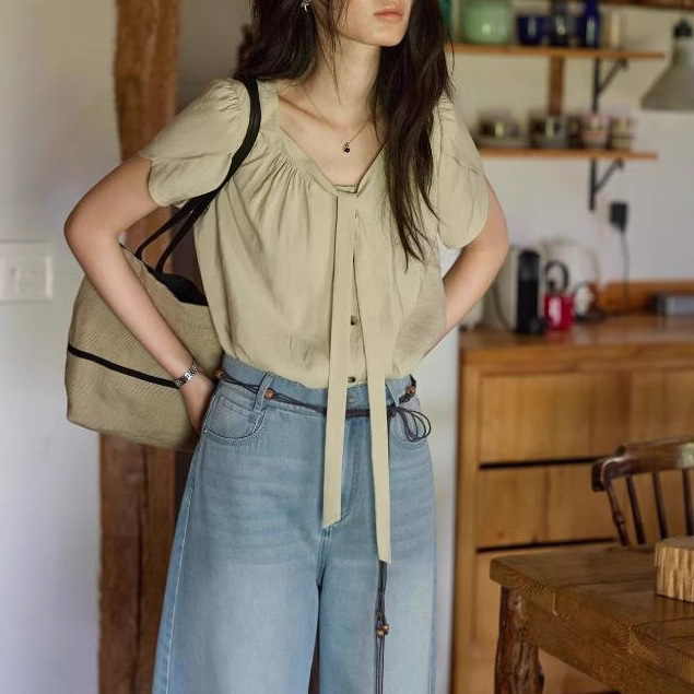 solihgter 法式莱赛尔飘带花瓣袖衬衫女夏季气质新款上衣